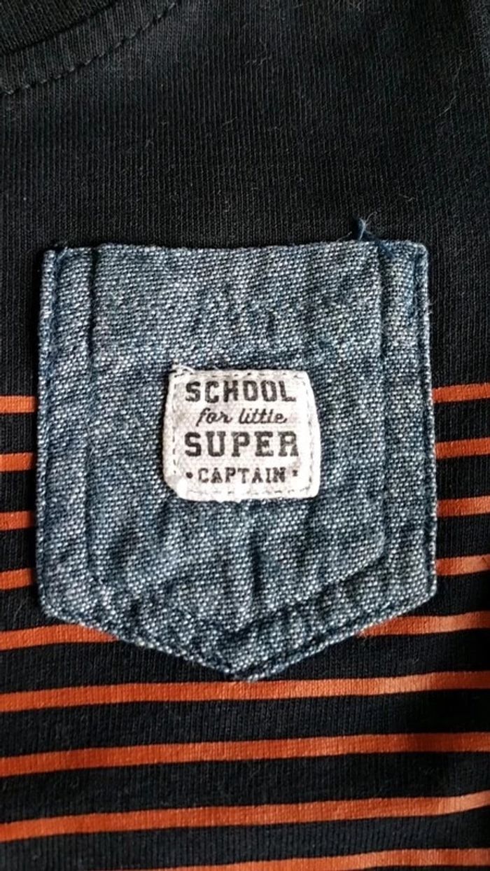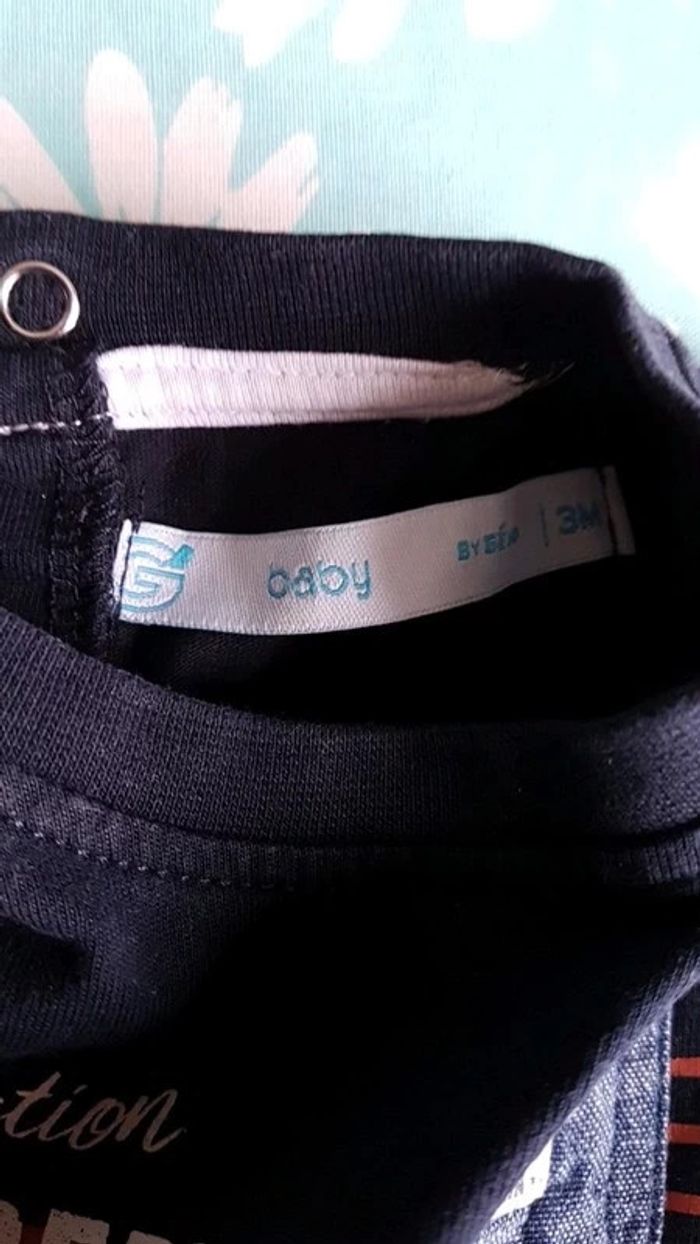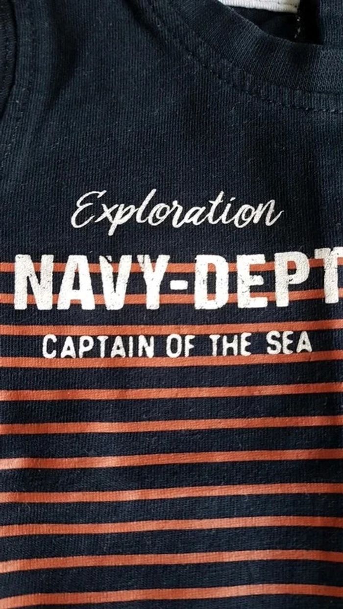 T-shirt manches longues bleu marine à rayures. Inscription exploration navy dept captain of the sea. Super mignon avec petite poche. Marque baby de gémo. Ouverture par pression dans le dos. Jamais porté, juste lavé. Taille 3 mois #3moisgarçonmel434343 (Caisse P6)