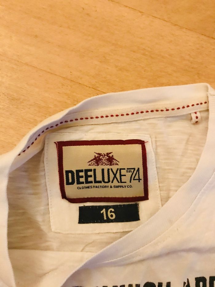 T-shirt garçon taille 16 ans Deeluxe Coloris blanc Imprimée gris, noir drapeau USA 🇺🇸 100 % coton Très bon état