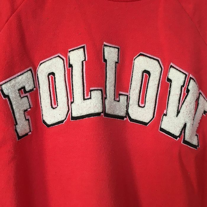 Sweat unisexe rouge taille 12 ans. Ecriture "FOLLOW" en relief Matière : 56% coton, 40% polyester, 4% élasthanne. En bon état