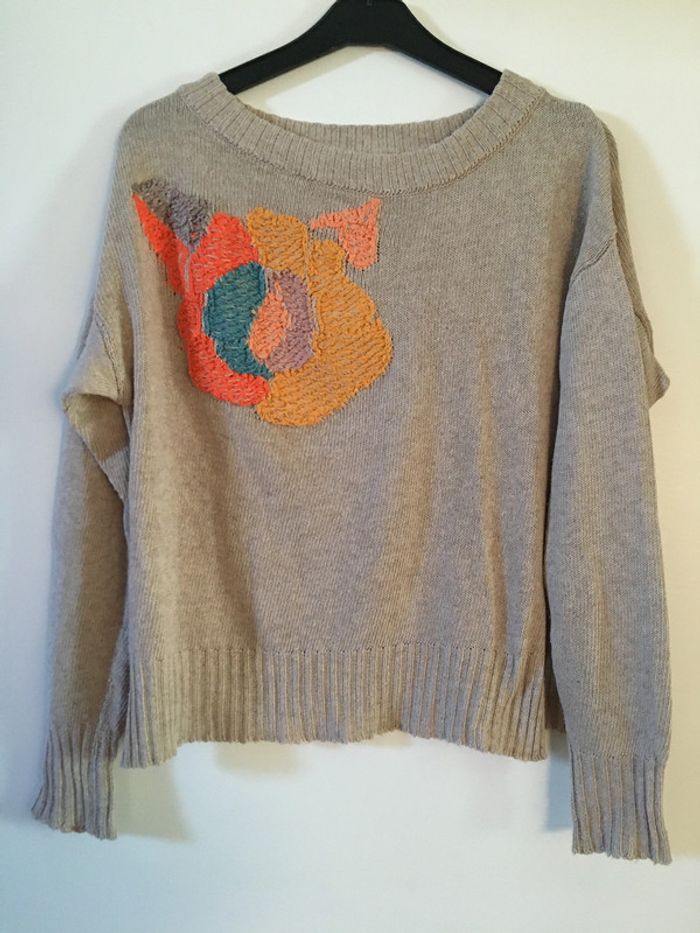 Pull fantaisie beige avec dessin brodé Marque : La fée maraboutée Petites fentes de chaque côté Taille 1 Matière : 53% coton et 47% acrylique