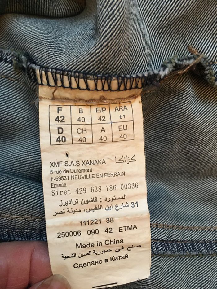 Veste en jean taille 42 de chez Xanaka Fermeture par 3 boutons et ceinture fantaisie élastique. 2 poches rabat et bouton. longueur 57cm - Largeur aisselles 49cm 64% coton - 35% polyester - 1% élasthanne