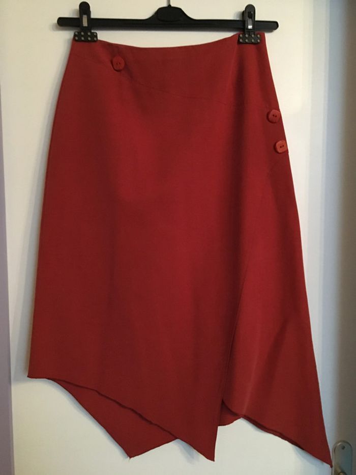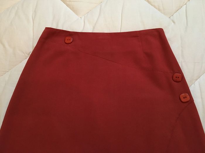 Jupe mi-longue coloris rouille. Panneau croisés avec découpe basse en décalée 3 boutons fantaisie Hauteur au plus long 87cm, au plus court 63cm 84% viscose - 11% polyamide - 5% coton Tombé impeccable