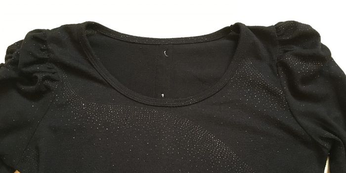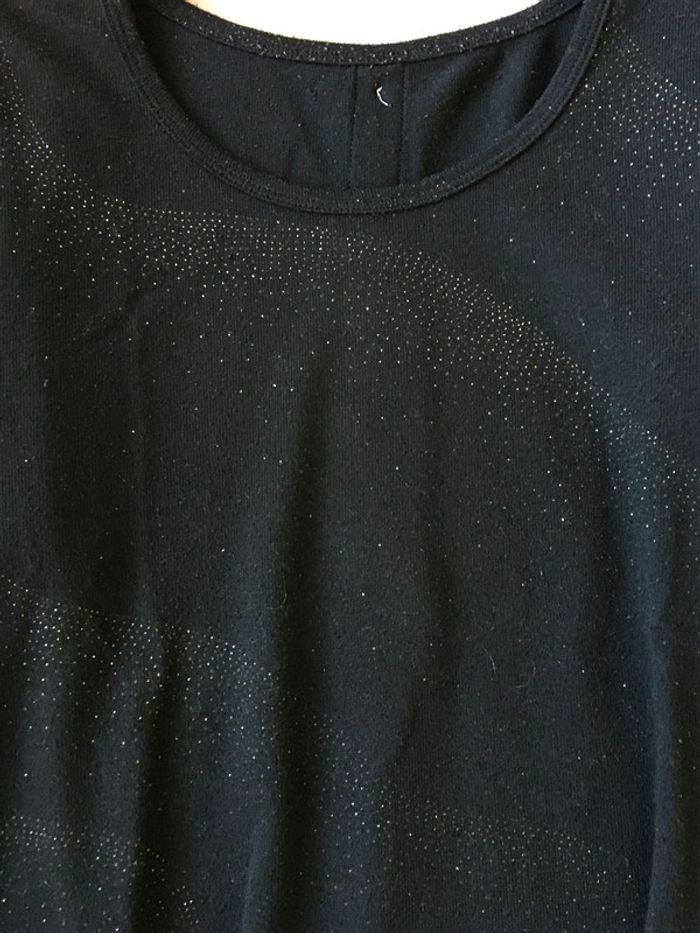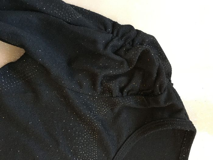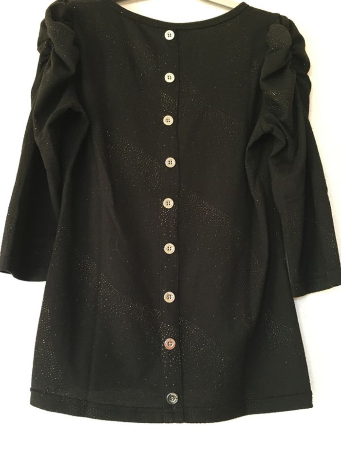 Pull fantaisie, encolure ronde, dessin pailleté devant et dos. Faux boutonnage au dos. Manches 7/8, haut légèrement bouffant Dimensions : Largeur sous aisselles 46 cm Longueur 61 cm