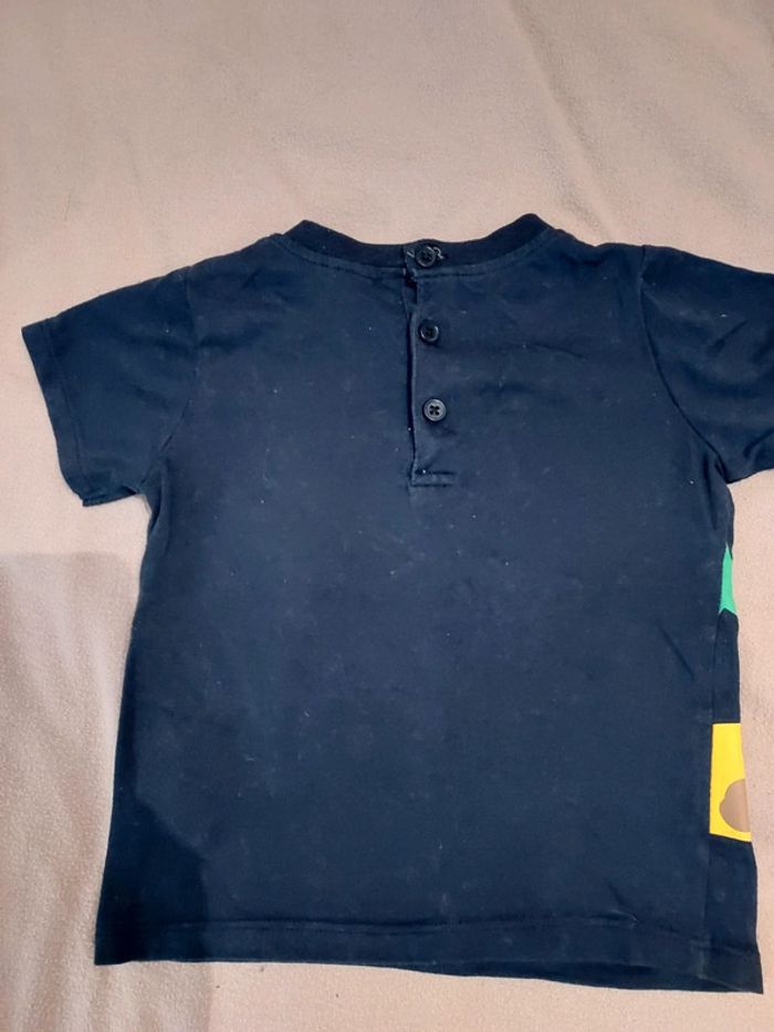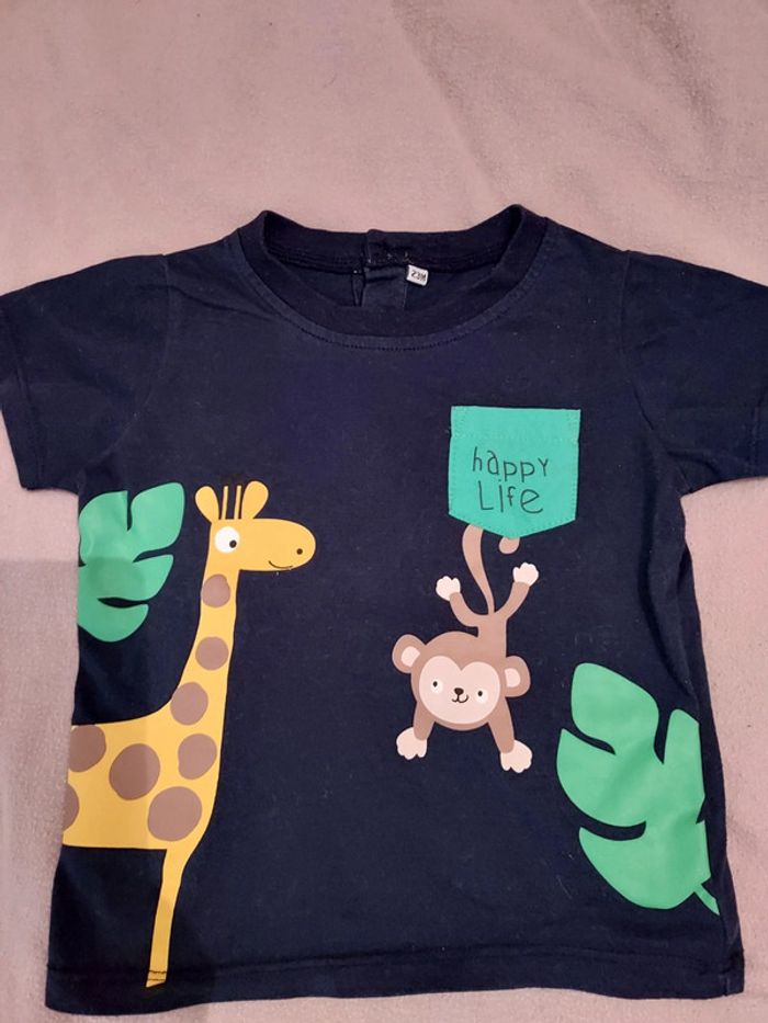 T-shirt très mignon, décors imprimés girafe, singe et feuilles, écriture "happy life" sur la petite poche à la poitrine. Ouverture pratique au dos par boutons. État impeccable, proche du neuf. Taille 23 mois. #sysasysa2ans