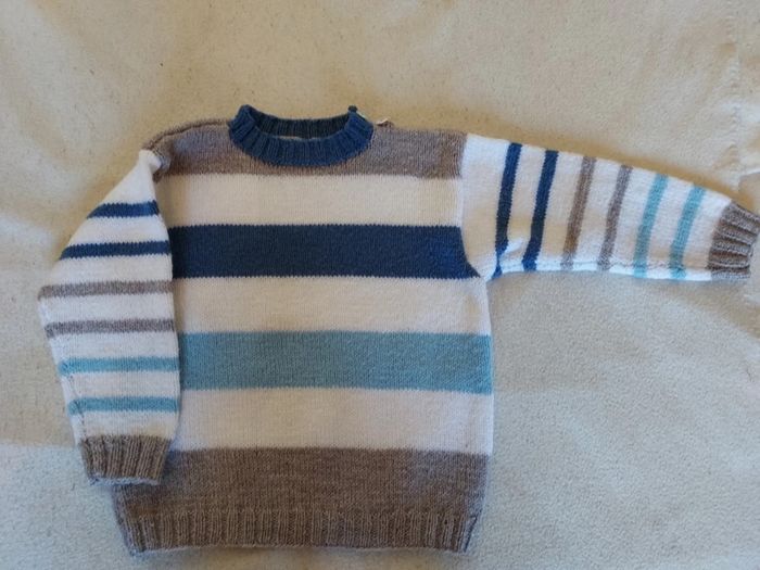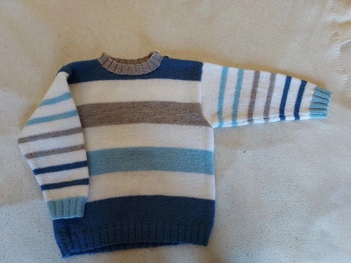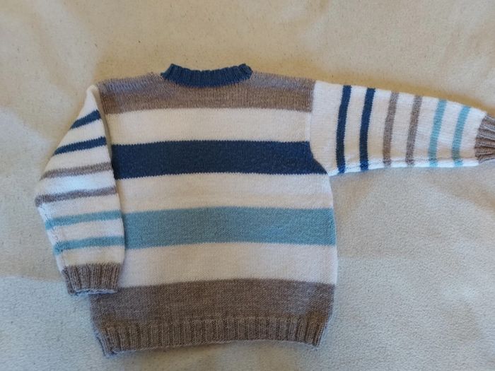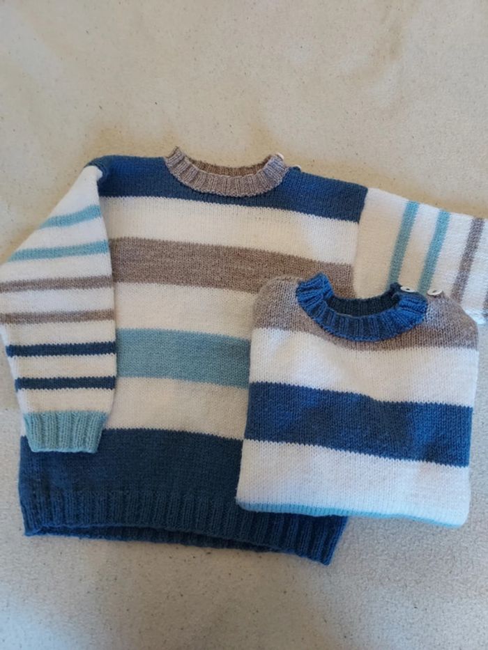 Lot de 2 pulls assortis faits main, taille 6 ans, excellent état. Le col ferme par 2 boutons. Bleu clair, bleu moyen, blanc, beige taupe. Prix non négociable pour ces très beaux articles. #sysasysa6ans #sysasysajumeaux