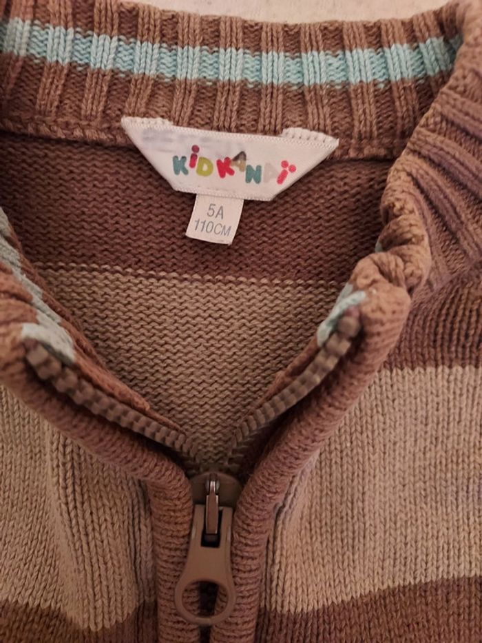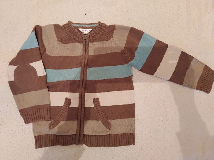 Gilet en coton taille 5 ans. Rayures brun moyen, beige foncé, écru et bleu turquoise clair. Très bon état. #sysasysa5ans