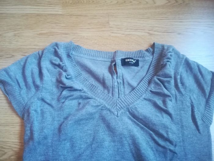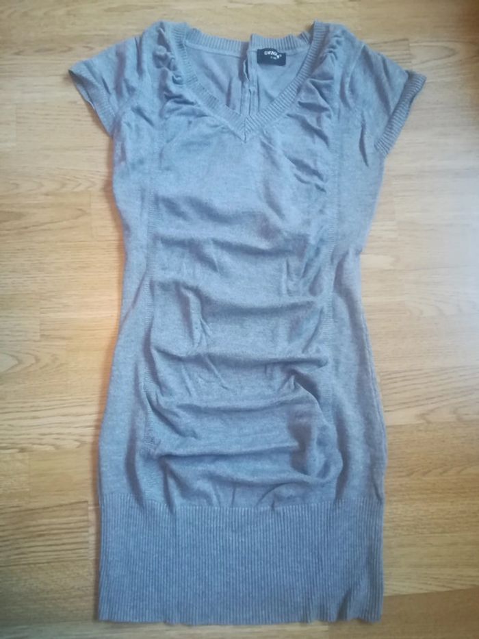 Pull tunique gris, effet froncé devant, 3 bodies dans le dos, près du corps. Taille 36. Très bon état, peu porté. #sysasysafemme36