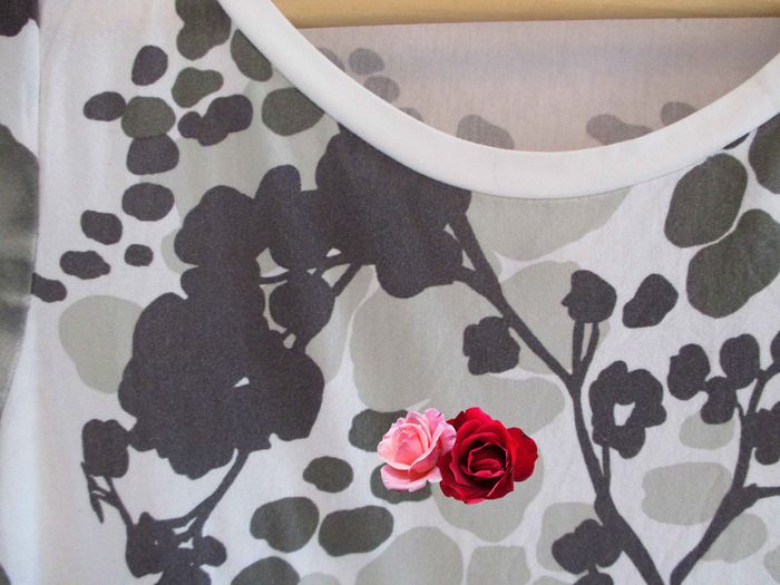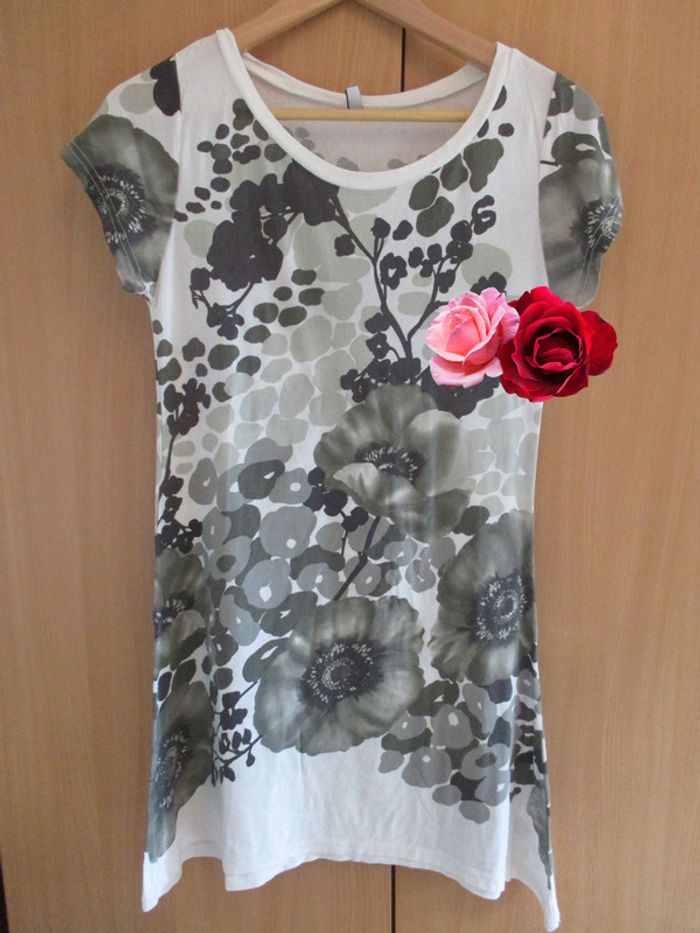 Portée mais elle est impeccable. Plutôt près du corps mais non moulante. Plus libre pour la partie basse, légèrement asymétrique: donne un joli mouvement. Fleurs vertes pâles, vertes grisées, kaki et brunes. #sysasysafemme36 #tunique #tshirt #teeshirt #S #36femme