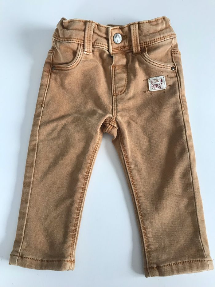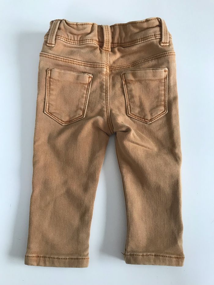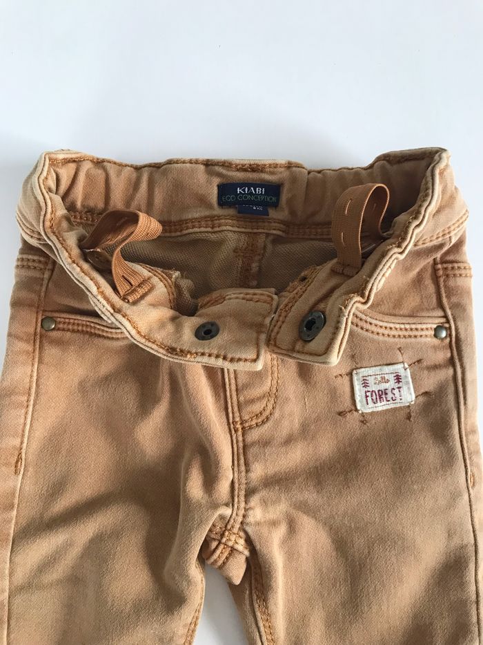Pantalon/jeans bébé moutarde (76% coton + 22% polyester + 2% elasthane), taille ajustable et ouverture par bouton pression. Fausses poches. Marque Kiabi. 6 mois