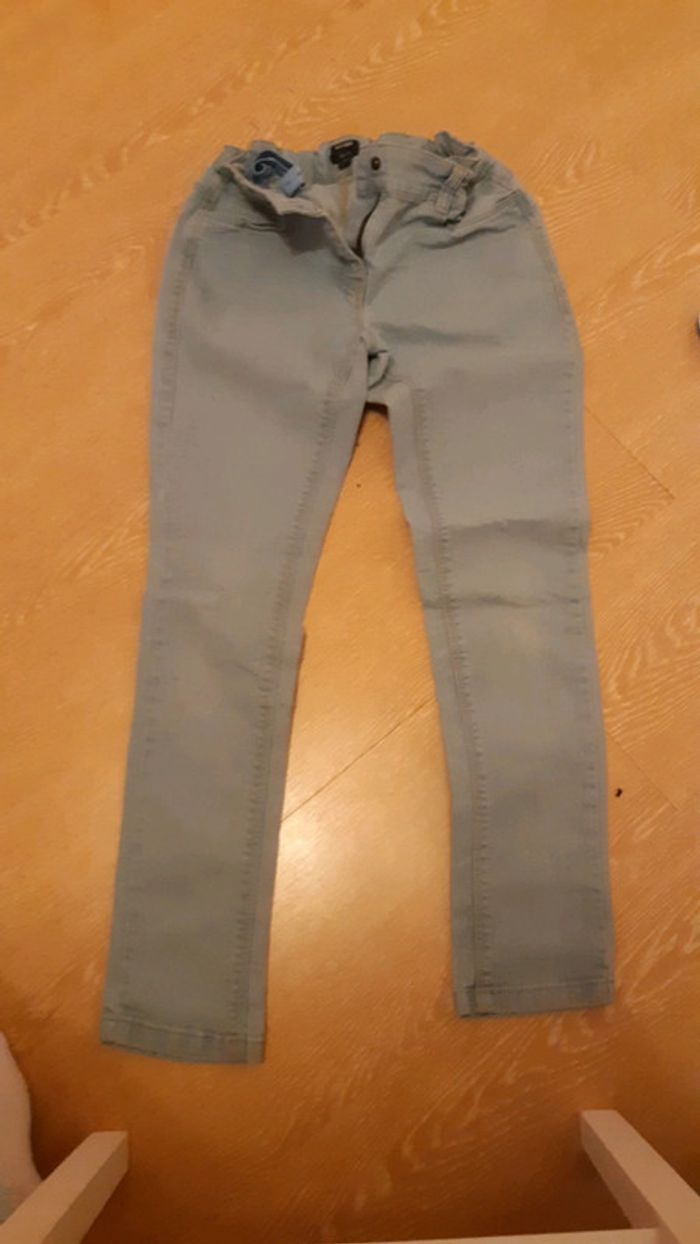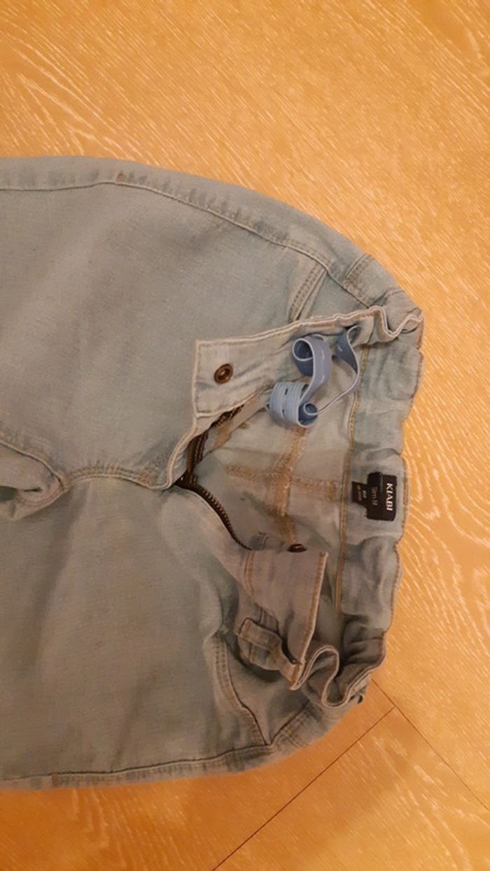 Jeans porté normalement. Resserable à la taille. Couleur délavée