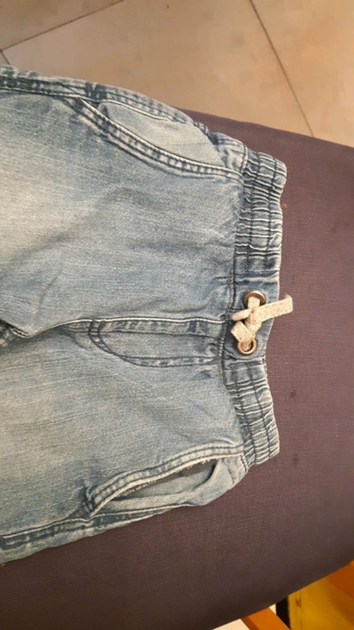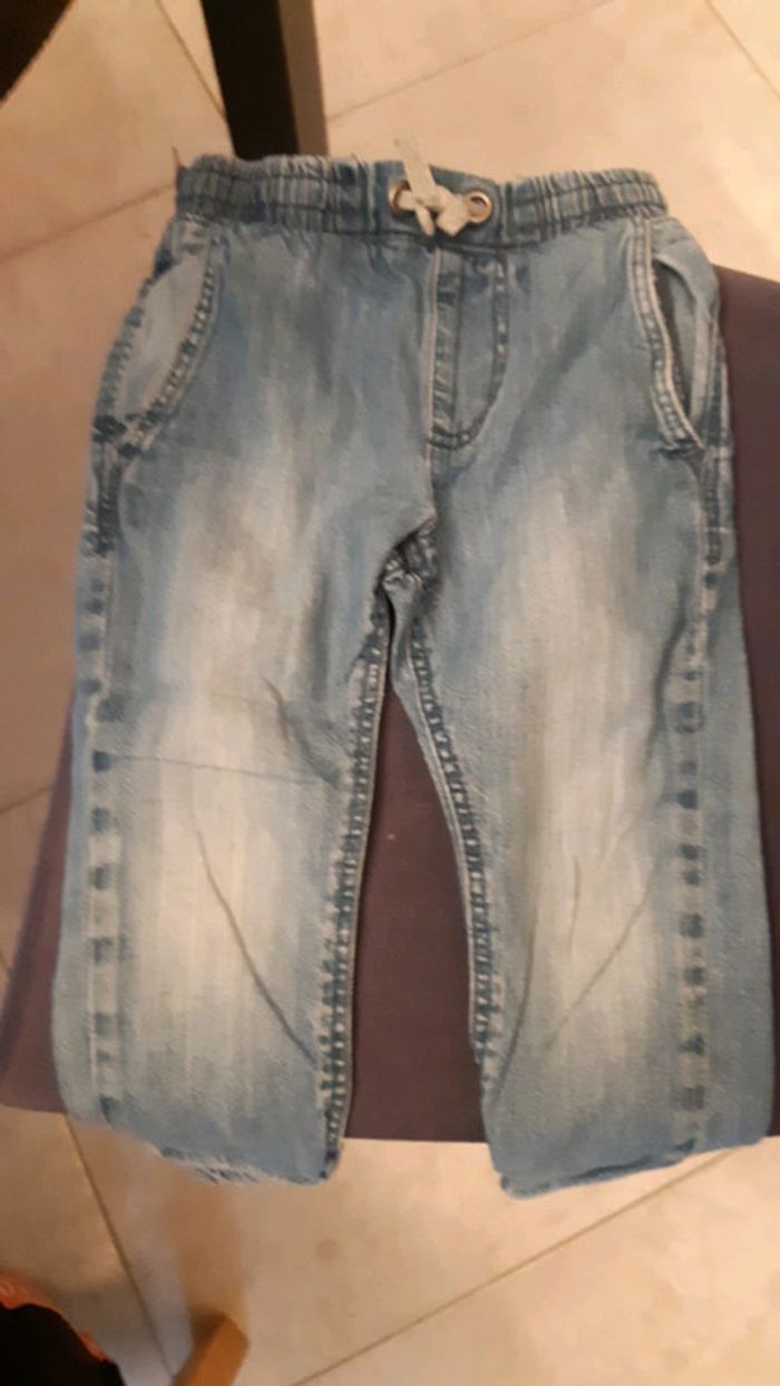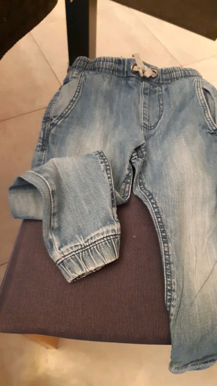 Jeans à élastique et en bas des jambes. Couleur un peu délavée sur le devant mais peu porté.