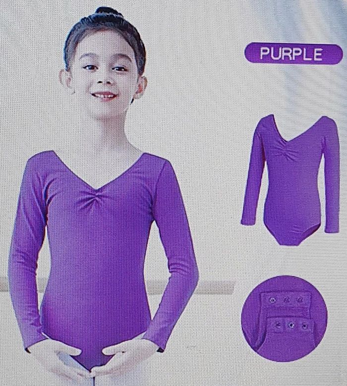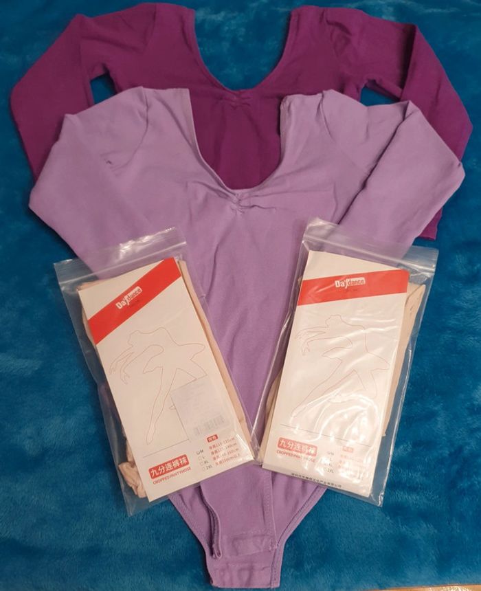 1 violet 1 mauve Les 2 photos à la fin montrent la bonne couleur des justaucorps, les photos étant trompeuses... Taille 115/125 cm correspond à du 6 ans mais taillent plus petits. Peu portés Les 2 paires de collants de gym seront donné avec le lot, ils ont été porté mais sont en bon état.