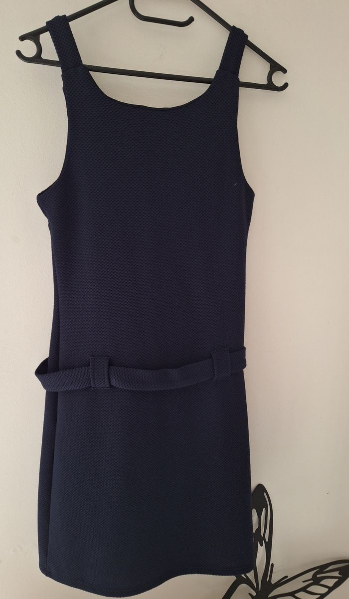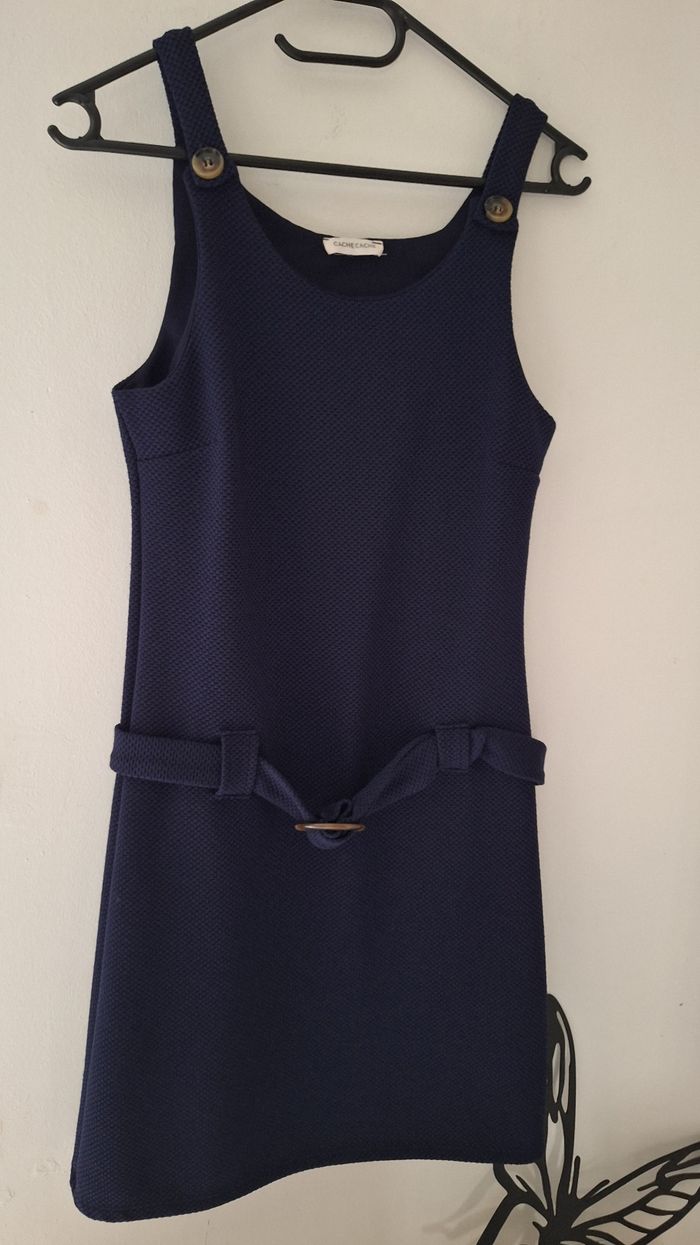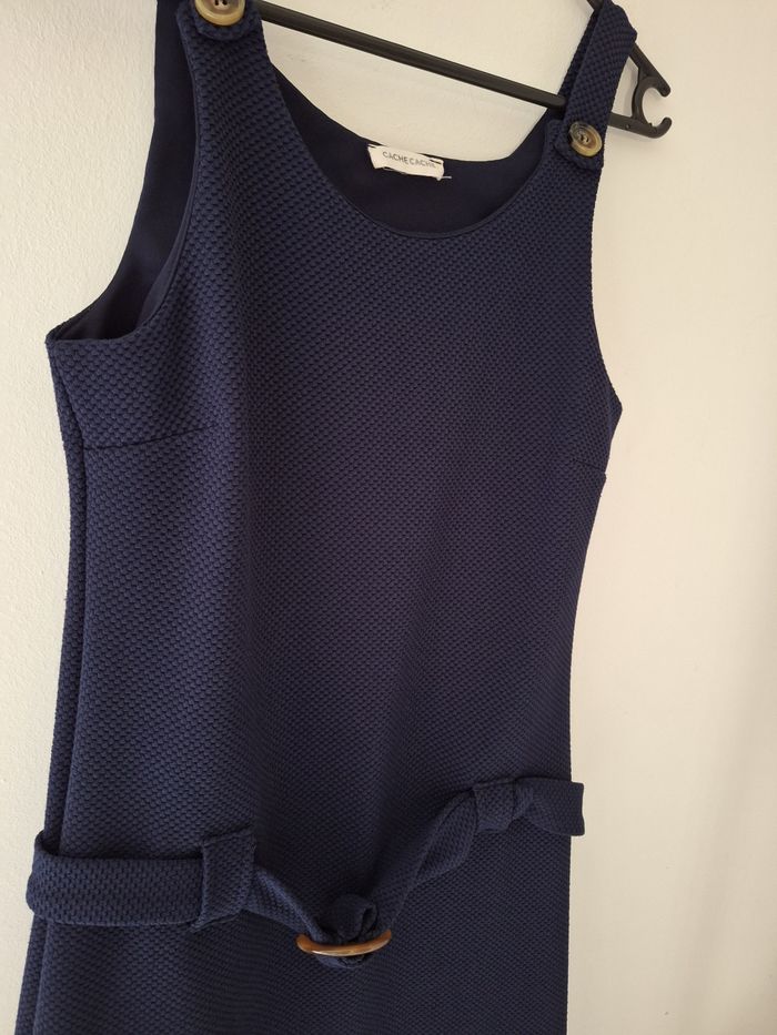 FEMME 36 / S N°1534 robe bleu marine Gauffré , bretelle Ceinture tissus Longueur 88 cm Taille 36 / s Cache cache 8,50€ #kelly_femmeT36