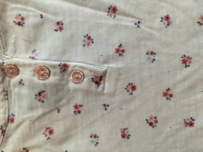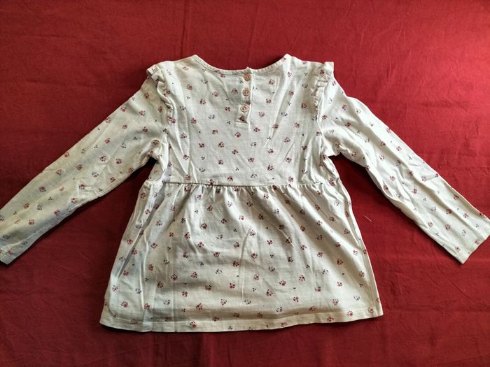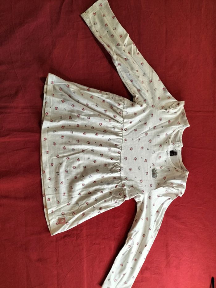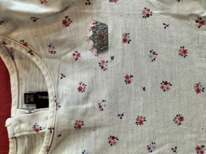 Tee-shirt style tunique manches longues blanc avec un écusson sur le devant en forme de couronne gris brillant et des dessins de fleurs rouge bleu corail en très bon état aucun trou ni tâche(cf voir photos) #bouriquet79fille6ans
