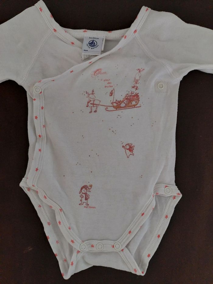 Peu porté. Très bon état. Ouverture ventrale à pression idéale pour les bébés. Taille 3 mois. #Camalimar_3mois