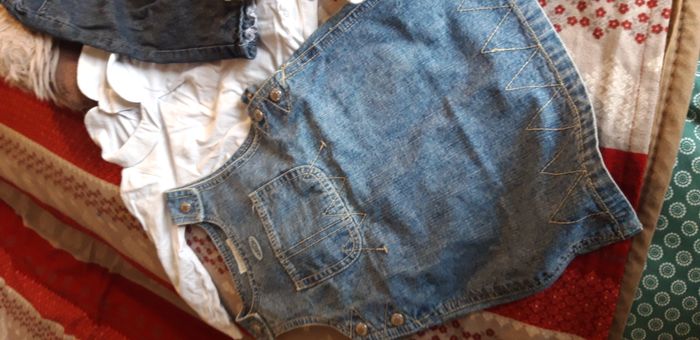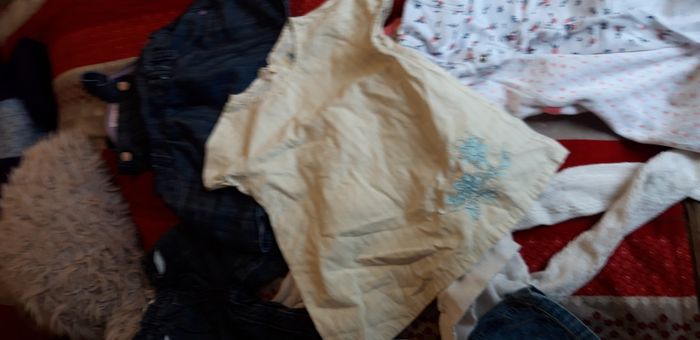 2 robes jeans + 1 body + 1 grenouillère + 1 robe toile + 1 jeans + 1 tee-shirt manches longues. Le tout en bon état