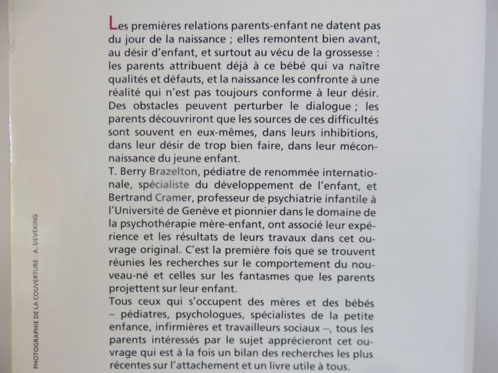 Les premières relations parents-enfant ne datent pas du jour de la naissance; elles remontent bien avant, au désir d'enfant, et surtout au vécu de la grossesse : les parents attribuent déjà à ce bébé qui va naître qualités et défauts, et la naissance les confronte à une réalité qui n'est pas toujours conforme à leur désir. Des obstacles peuvent perturber le dialogue; les parents découvriront que les sources de ces difficultés sont souvent en eux-mêmes, dans leurs inhibitions, dans leur désir de trop bien faire, dans leur méconnaissance du jeune enfant. T. Berry Brazelton, pédiatre de renommée internationale, spécialiste du développement de l'enfant, et Bertrand Cramer, professeur de psychiatrie infantile à l'Université de Genève et pionnier dans le domaine de la psychothérapie mère-enfant, ont associé leur expérience et les résultats de leurs travaux dans cet ouvrage original. C'est la première fois que se trouvent réunies les recherches sur le comportement du nouveau-né et celles sur les fantasmes que les parents projettent sur leur enfant. Tous ceux qui s'occupent des mères et des bébés - pédiatres, psychologues, spécialistes de la petite enfance, infirmières et travailleurs sociaux - tous les parents intéressés par le sujet apprécieront cet ouvrage qui est à la fois un bilan des recherches les plus récentes sur l'attachement et un livre utile à tous.