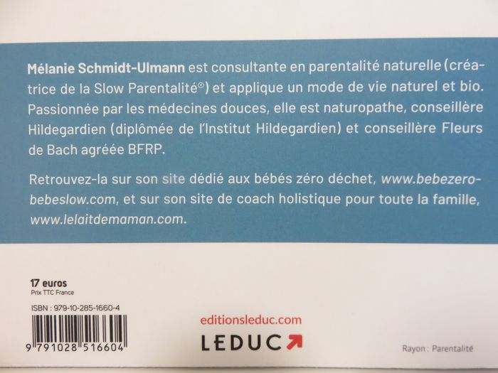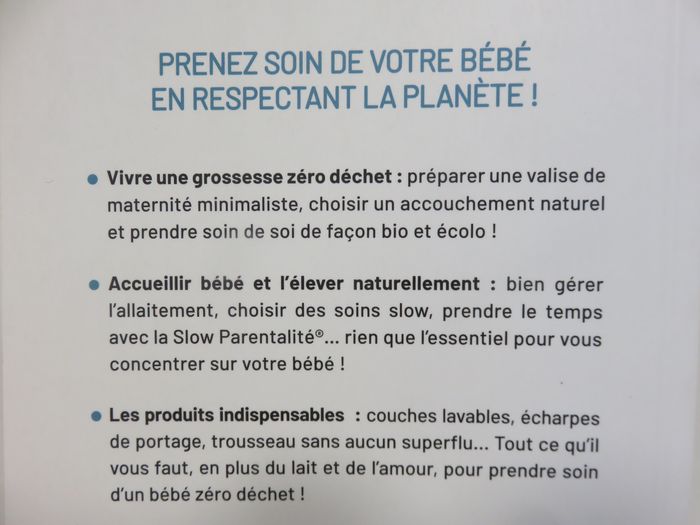 💰 PRIX FIXE ⚠️ ÉTAT : Très bon état ⚠️ DÉTAILS : Auteur(s) : Mélanie Schmidt-ulmann Editeur : Leduc Langue : français Date de parution : 16/02/2021 256 pages ⚠️ RÉSUMÉ : Vivre une grossesse zéro déchet : préparer une valise de maternité minimaliste, choisir un accouchement naturel et prendre soin de soi de façon bio et écolo ! Accueillir bébé et l'élever naturellement : bien gérer l'allaitement, choisir des soins slow, prendre le temps avec la Slow Parentalité®... rien que l'essentiel pour vous concentrer sur votre bébé ! Les produits indispensables : couches lavables, écharpes de portage, trousseau sans aucun superflu... Tout ce qu'il vous faut, en plus du lait et de l'amour, pour prendre soin d'un bébé zéro déchet ! 📦 LIVRAISON : Possibilité de remise en main propre sur Lyon