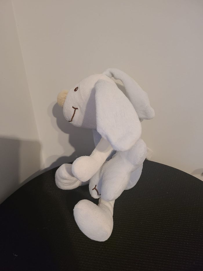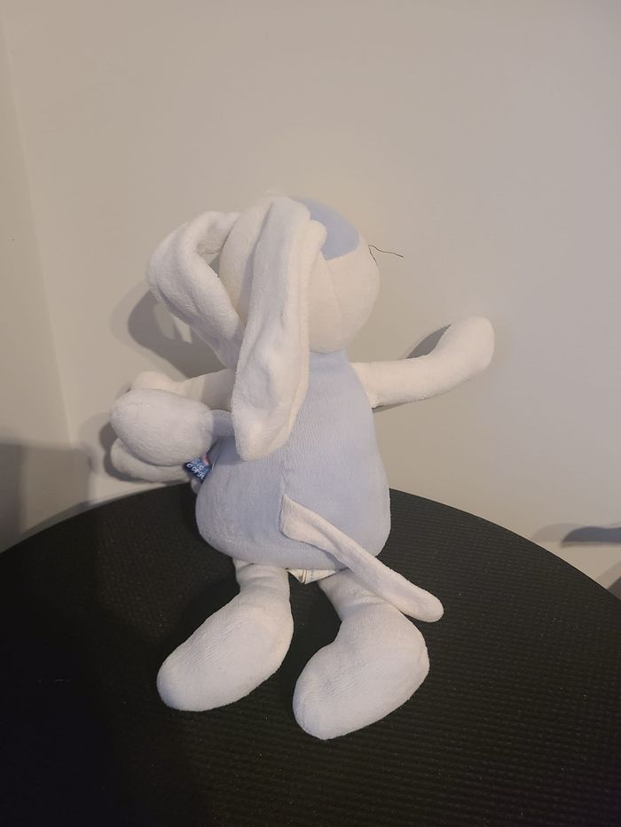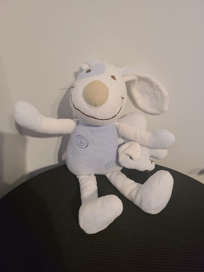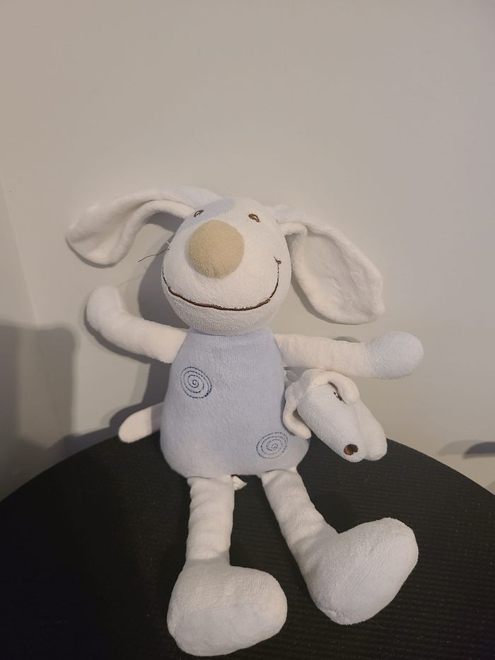 PELUCHE MUSICALE CHIEN SUCRE D'ORGE BLEU BLANC SPIRALES AVEC DOUDOU 30 CM 118