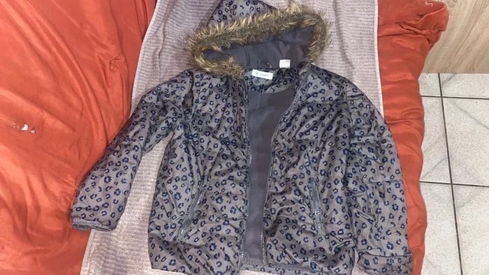 Doudoune fille avec capuche et poche en bon état style motif léopard avec doublure à l intérieur Marque essentiel taille 8 ans