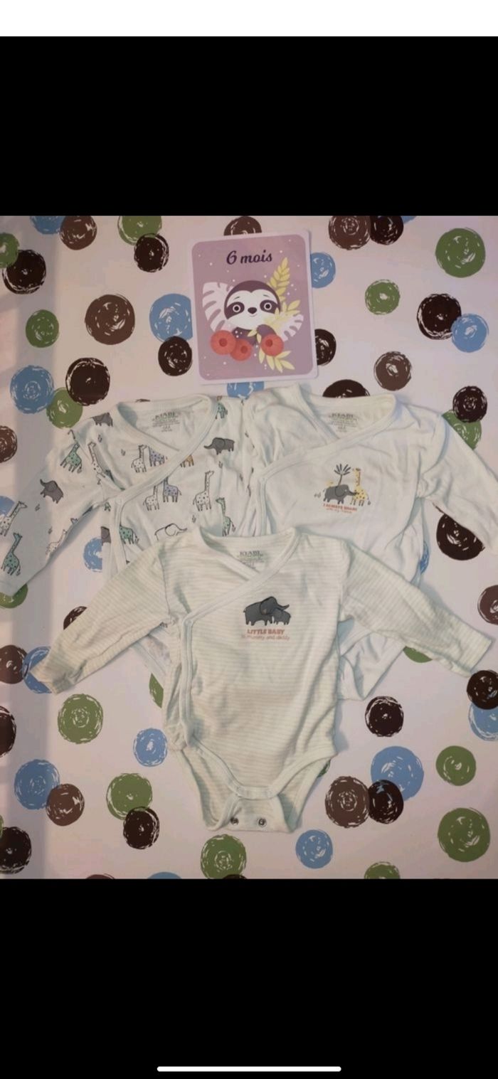 Lot de 3 bodies taille 6 mois en très bon état Motif savane de chez Kiabi