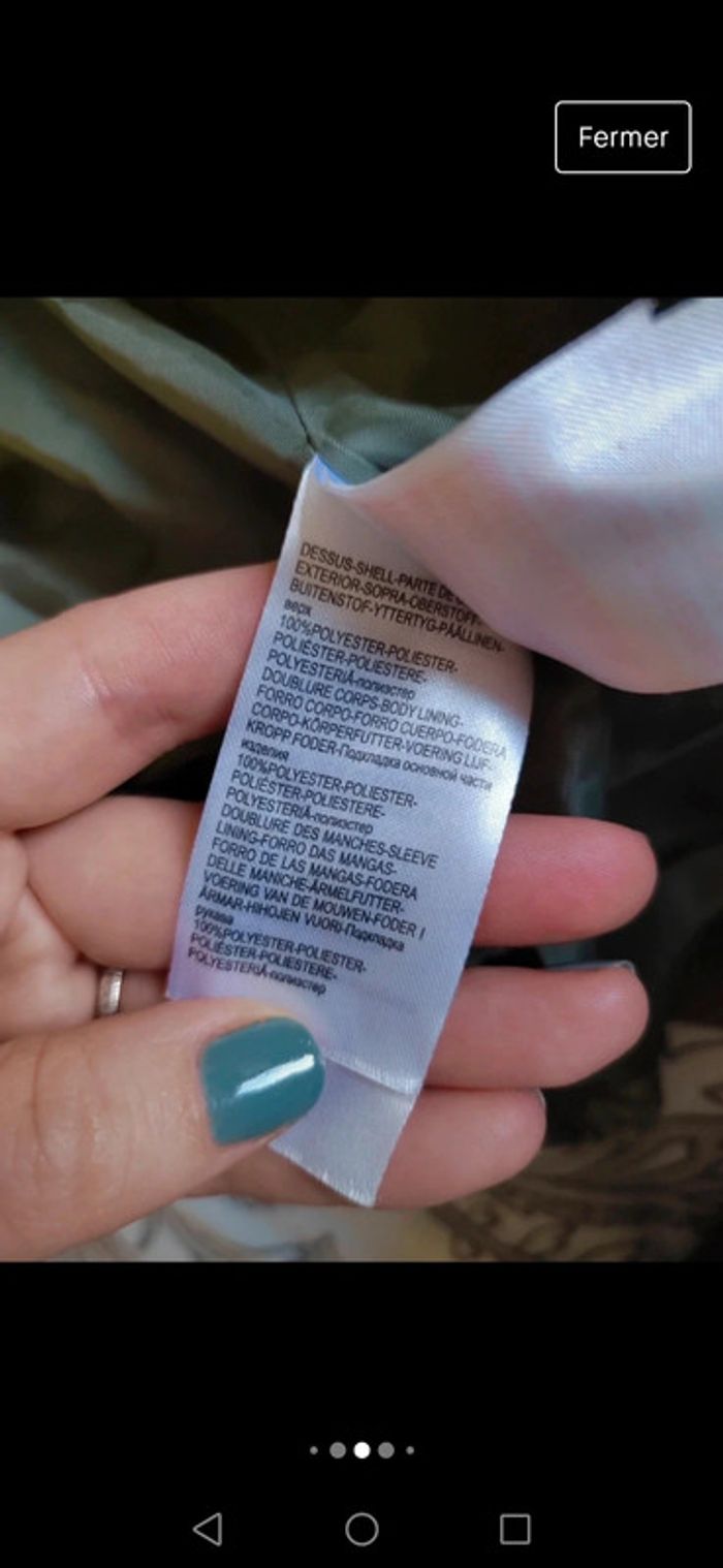 La doudoune sans manche peut se séparer du coupe vent. Ideal mi saison mais trop léger pour hiver Photo portée en dernière photo A été lavée parfait état. Fermetures éclairs OK pas de trou. Petit embout pour fermer le zip cassé (voir photo) mais n'empêche pas l'utilisation normale du manteau. La taille se resserre si besoin voir photos