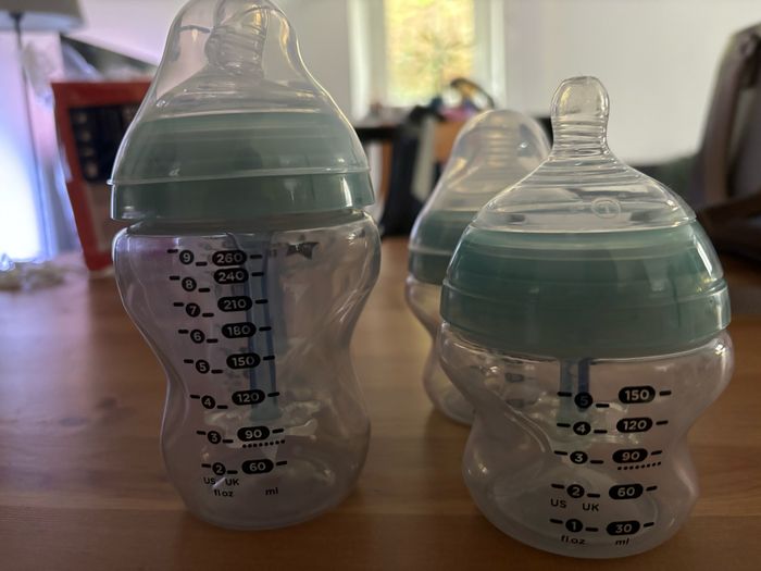 Nous vendons ce lot de 4 biberons tommee tippee car nous ne les utilisons plus. Il manque deux capuchons.