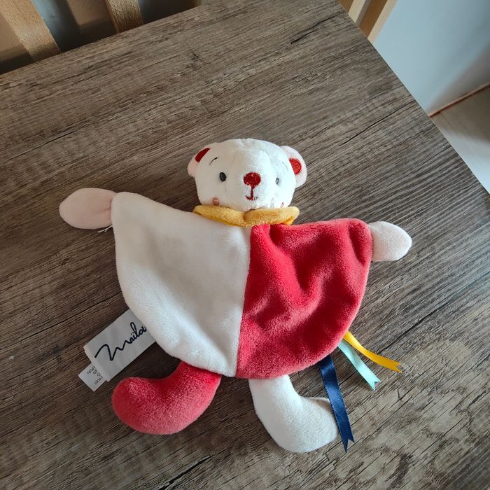 Doudou ours plat demi rond rouge et blanc, col jaune, rubans bleu et jaune. Maïlou, groupe Doudou et Compagnie 12 euros Envoi en relais
