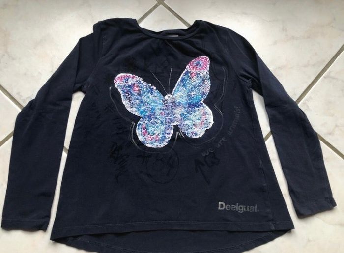 joli tee-shirt bleu marine motif papillon de la marque Desigual taille 7/8 ans (122/126 cm). très bon état