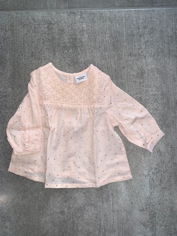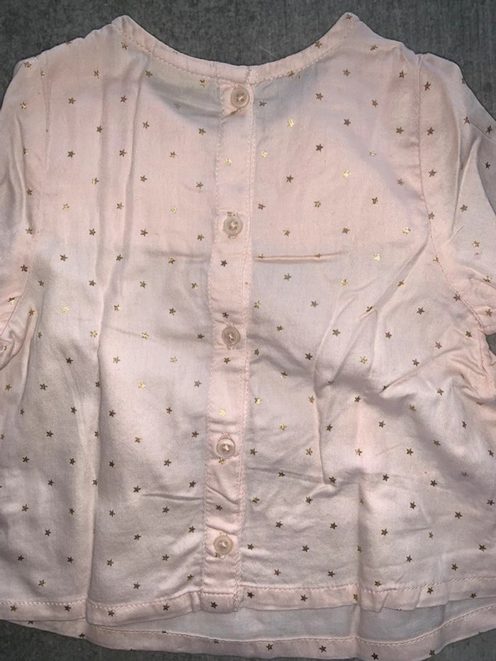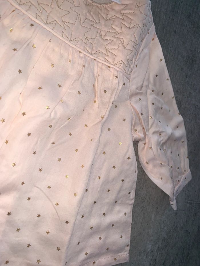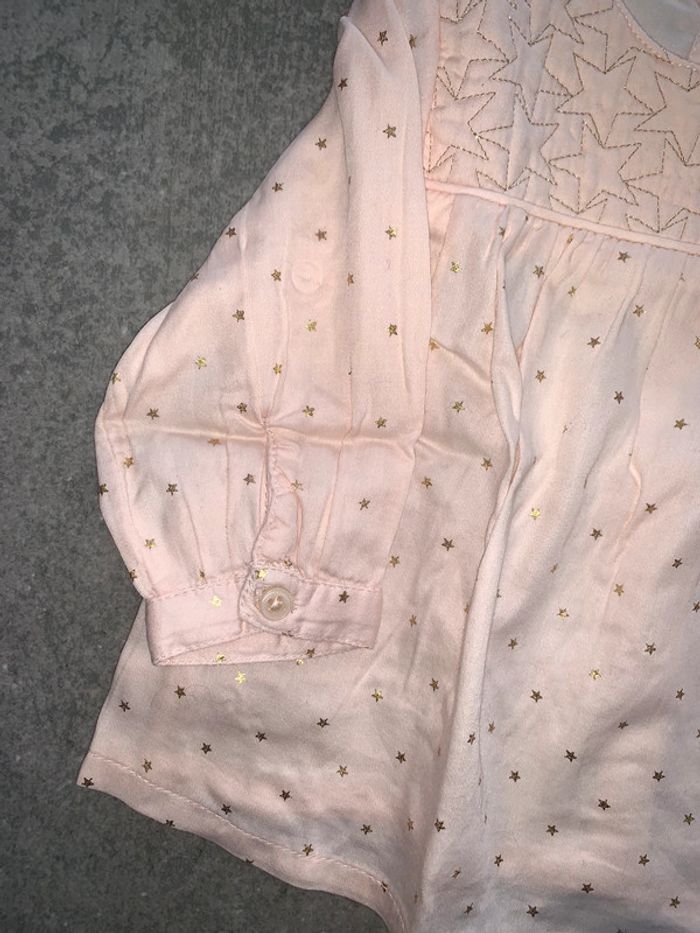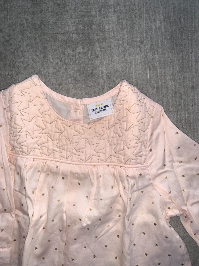 Chemise blouse bébé fille tao tape à l’œil Rose clair Motif all over étoiles dorées Encolure arrondie Empiècement poitrine effet matelassé : surpiqûres dorées Fronces sous empiècement Manches longues : fentes + boutons Tissu souple fluide Ouverture fermeture dos : boutons Coupe évasée Bas courbe Taille 3mois : 59 cm Portée une fois