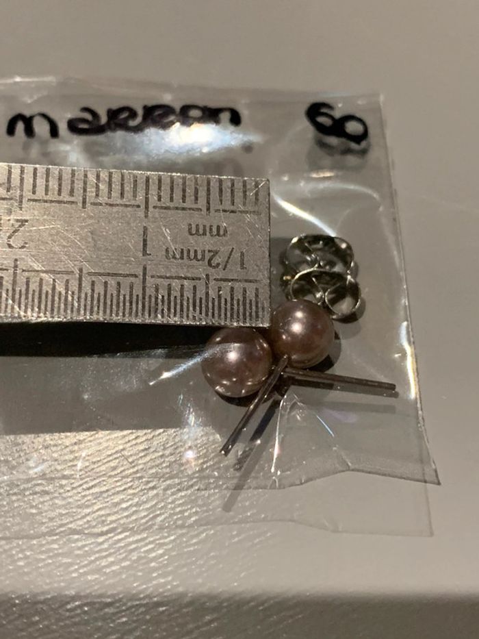 Boucles d’oreilles Adopt’ n•60 Perles boules marron Imitation perle de culture Structures tiges + fermoirs argentés Bijoux Les dimensions de chaque paire sont à voire sur la dernière photo. Un réglet est placé à côté afin de montrer la dimension. (Les numéros notés sur les pochette sont en guise de repères, me permettant de ne pas confondre les différentes boucles que je propose à la vente).