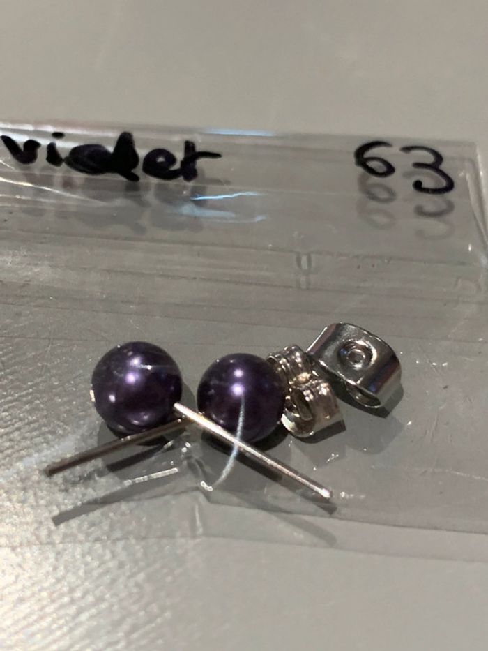 Boucles d’oreilles Adopt’ n•63 Perles boules violet Imitation perle de culture Structures tiges + fermoirs argentés Bijoux Les dimensions de chaque paire sont à voire sur la dernière photo. Un réglet est placé à côté afin de montrer la dimension. (Les numéros notés sur les pochette sont en guise de repères, me permettant de ne pas confondre les différentes boucles que je propose à la vente).