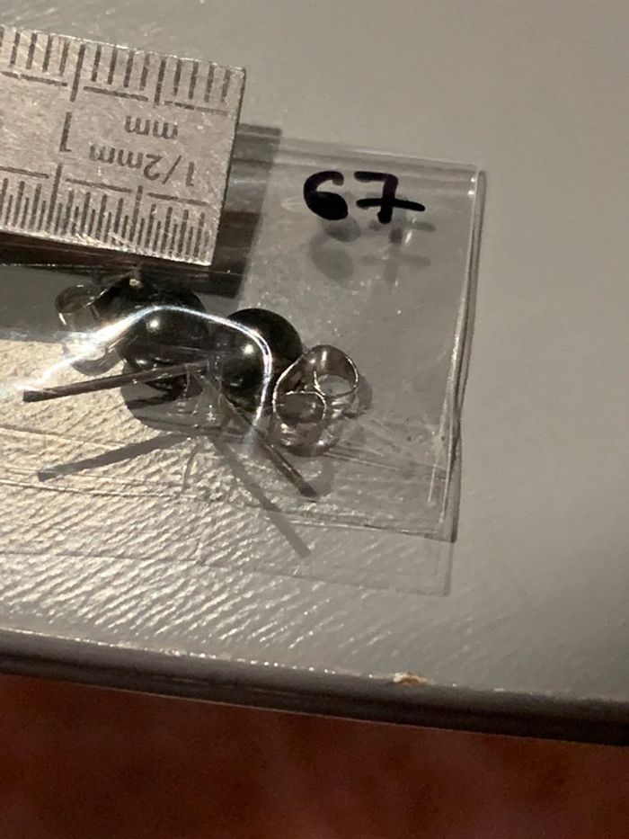 Boucles d’oreilles Adopt’ n•67 Perles boules noir Imitation perle de culture Structures tiges + fermoirs argentés Bijoux Les dimensions de chaque paire sont à voire sur la dernière photo. Un réglet est placé à côté afin de montrer la dimension. (Les numéros notés sur les pochette sont en guise de repères, me permettant de ne pas confondre les différentes boucles que je propose à la vente).