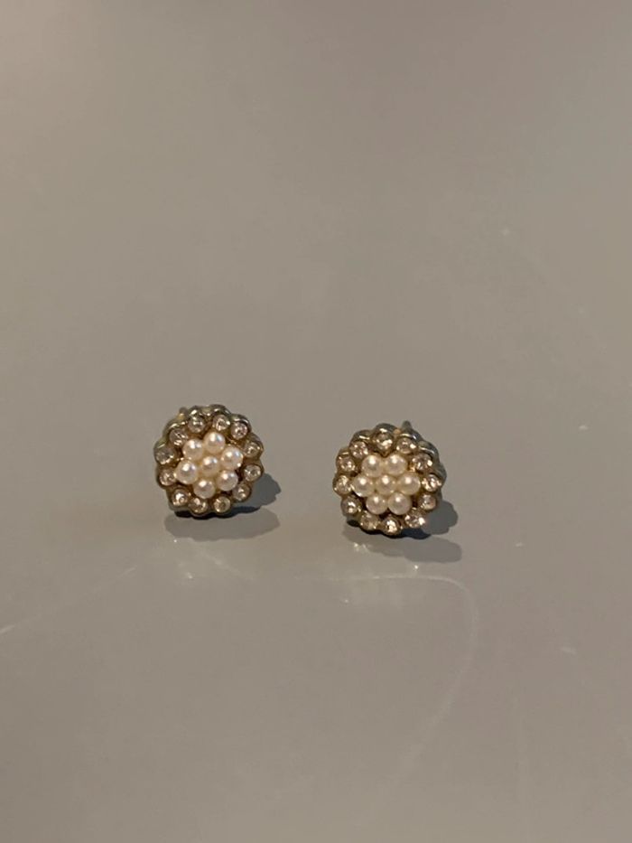 boucles d’oreilles histoire d’or Fleur perle blanche + strass pierre au centre - photo numéro 1