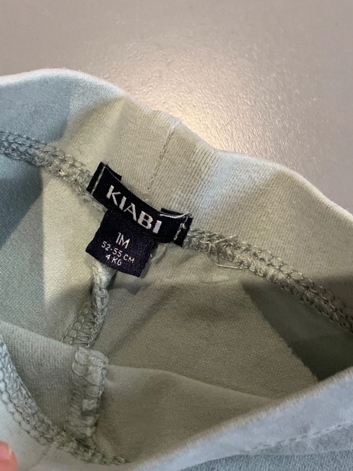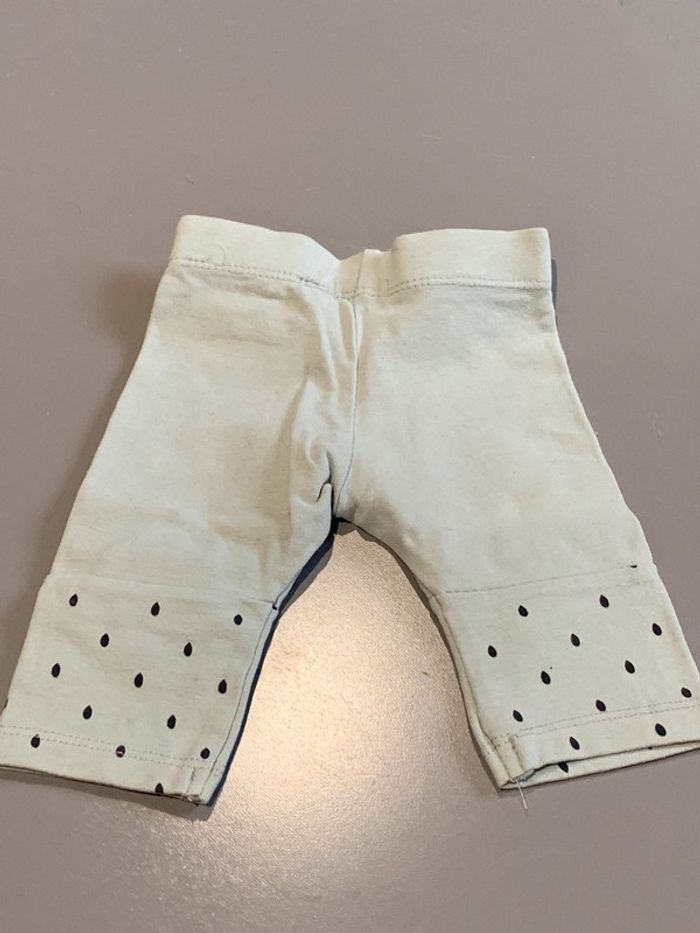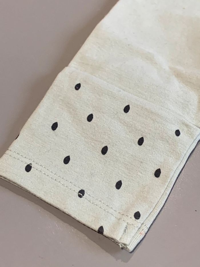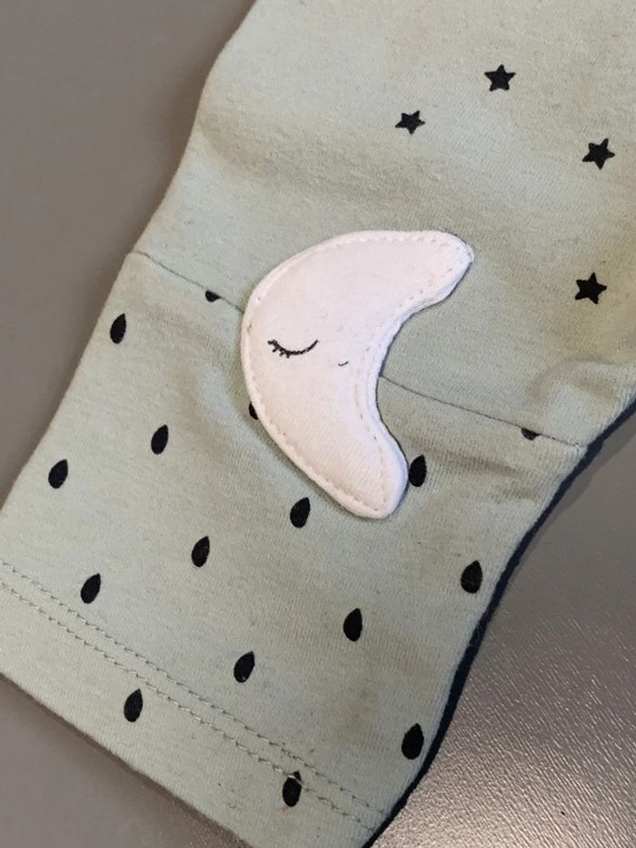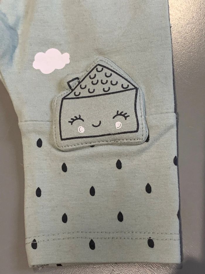 legging enfant bébé fille Kiabi coloris vert, blanc, noir Visuel print sérigraphie gouttes de pluie et nuage + application maison + lune Découpes genoux tissu avec élasthane ceinture élastiquée Taille 1 mois : 52/55cm Porté une fois