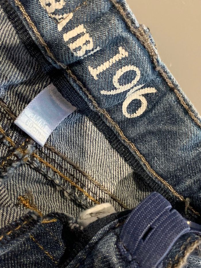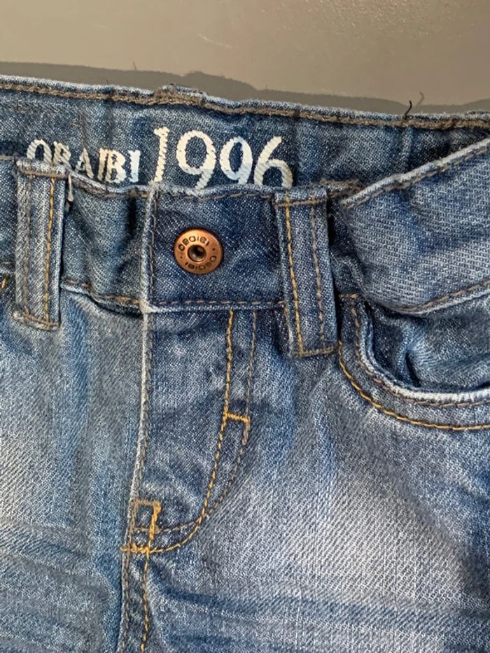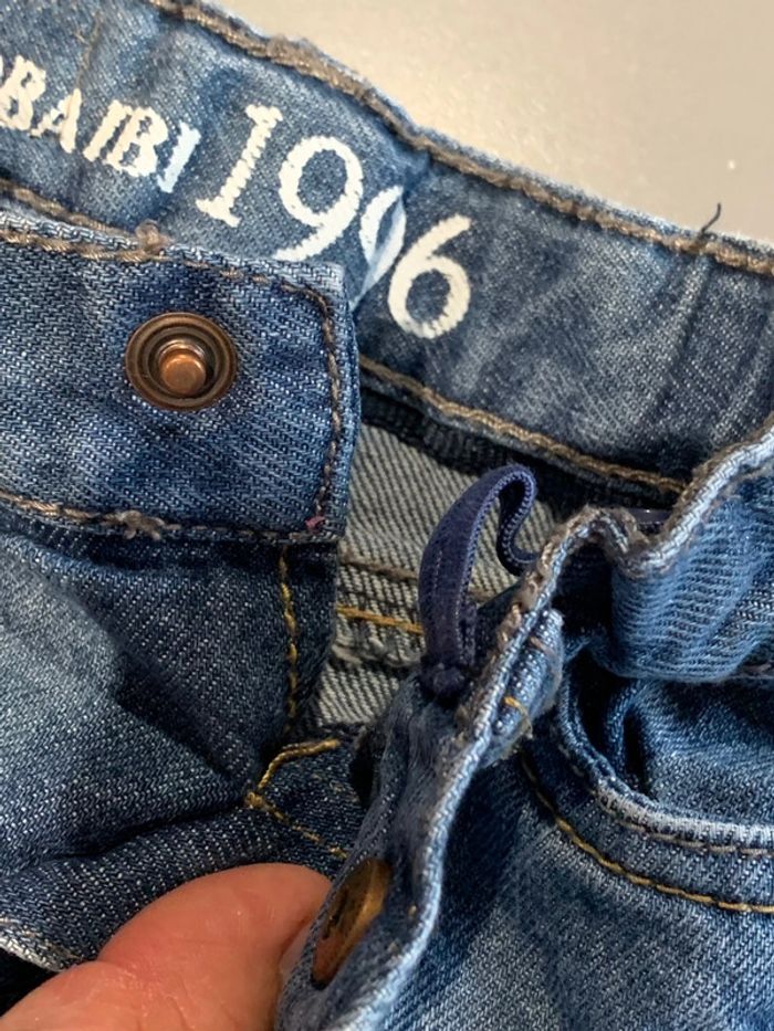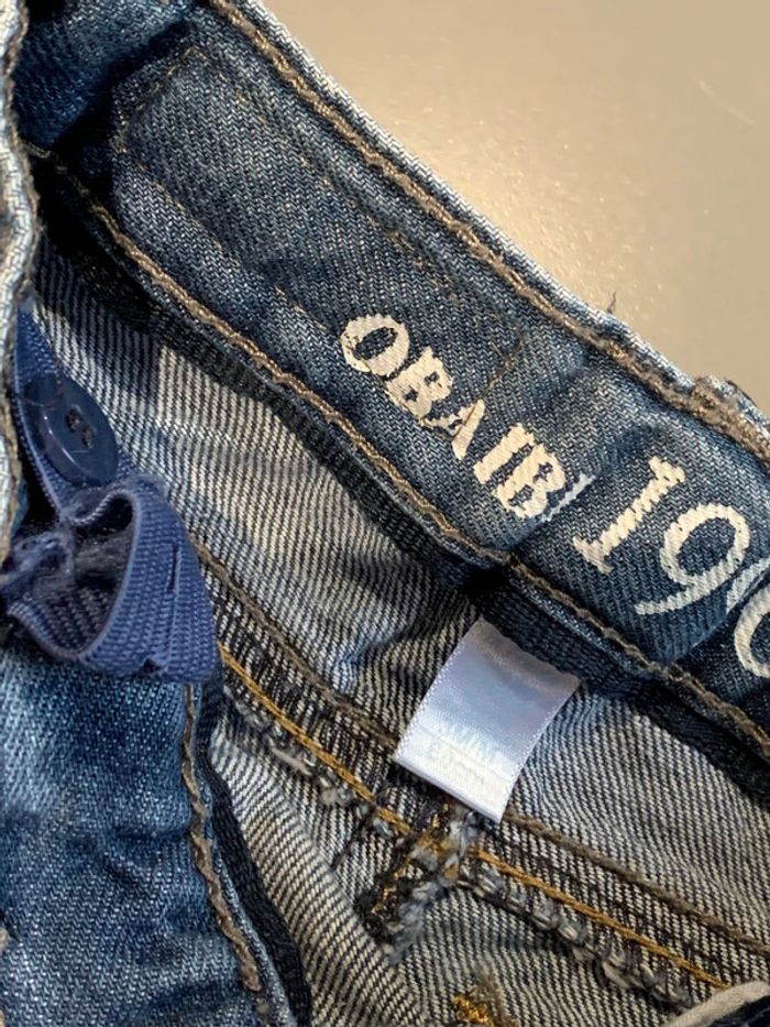 pantalon jean enfant bébé garçon Obaïbi Okaïdi Denim coloris bleu avec délavage + plissages Sérigraphie intérieur blanche jambes longues coupe droite Surpiqûres ocre camel porté 1 fois ceinture réglable (élastique intérieur) avec coulants pour passage ceinture Poches devant et dos 3 mois : 60 cm