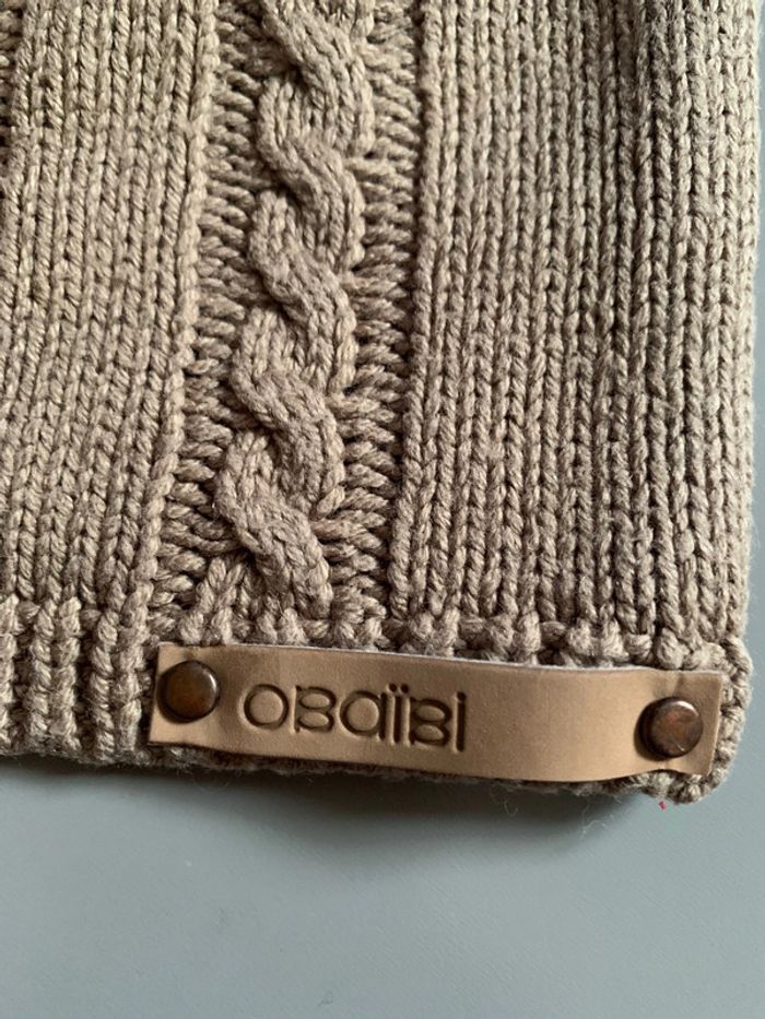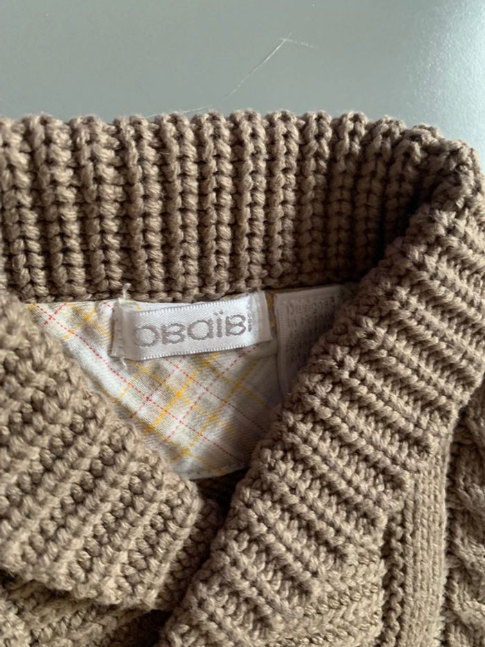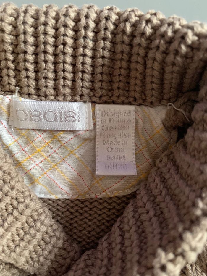 Boléro pull sans manche bébé garçon Okaïdi Obaïbi Lainage marron Plat + tressé Col châle Finition bords cotes Coupe droite Bas droit Etiquette déco simili cuir avec logo