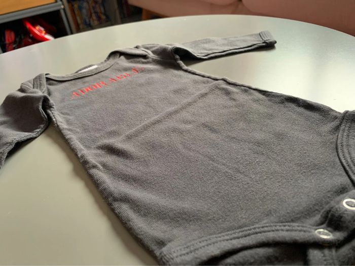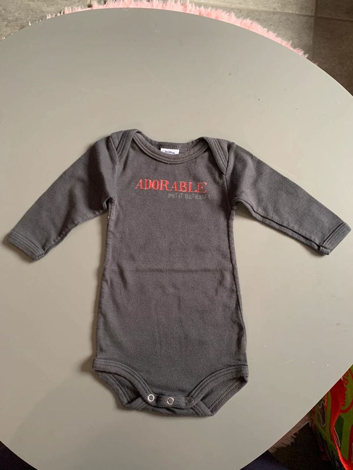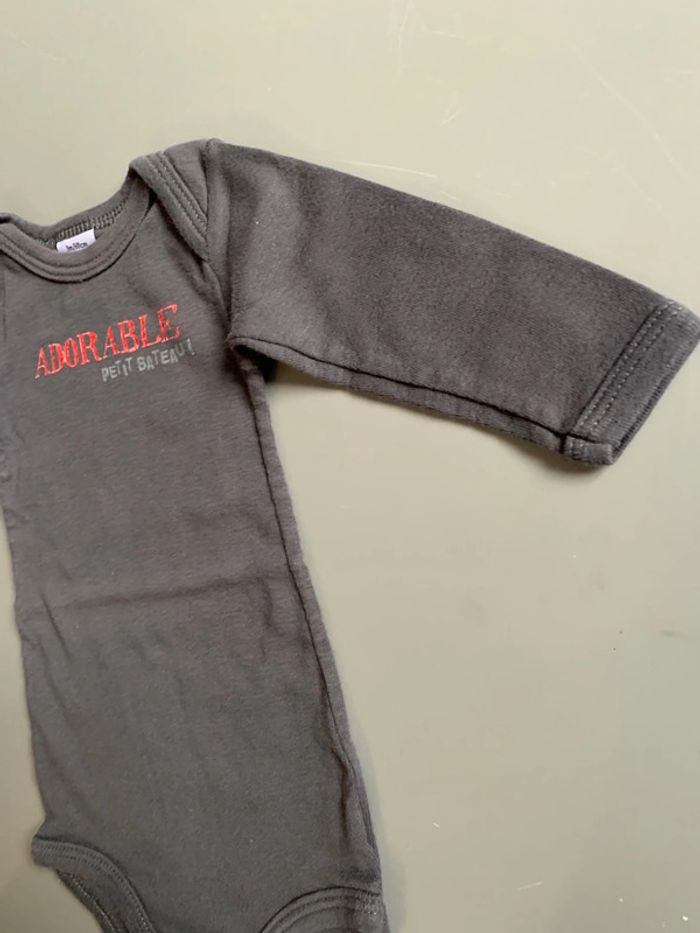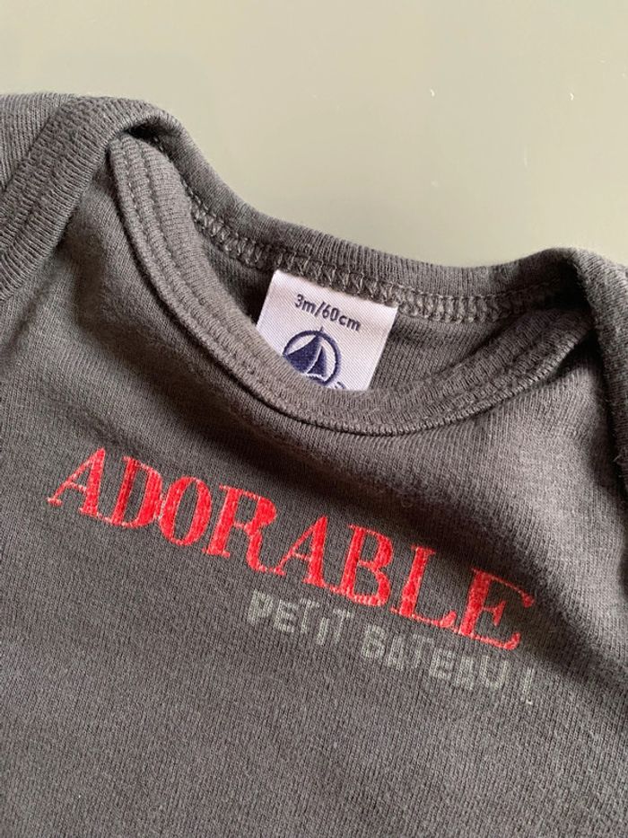 Body bébé garçon petit bateau Gris Visuel sérigraphie print rouge adorable + logo gris Manches longues Encolure arrondie Ouverture fermeture entrejambe : boutons pressions Coupe droite Tissu souple avec élasthane Taille 3 mois :60cm