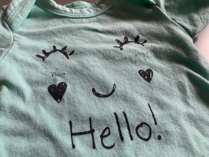 Body bébé fille Kiabi Vert menthe Visuel sérigraphie print : yeux dormeurs + coeurs + hello : gris anthracite Manches courtes Encolure arrondie Ouverture fermeture entrejambe : boutons pressions Coupe droite Tissu souple avec élasthane Porté une fois