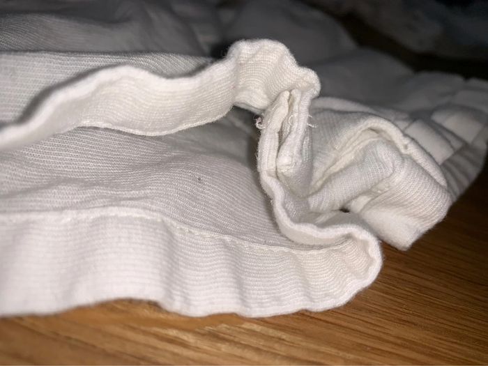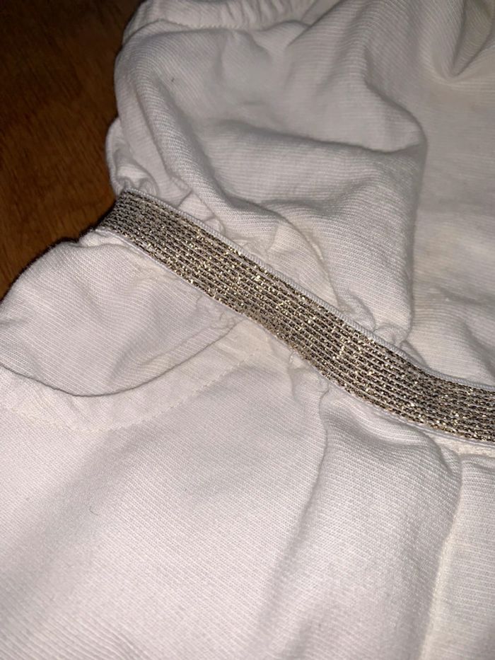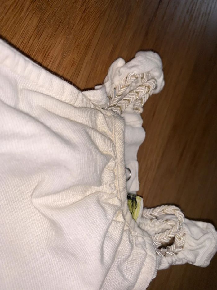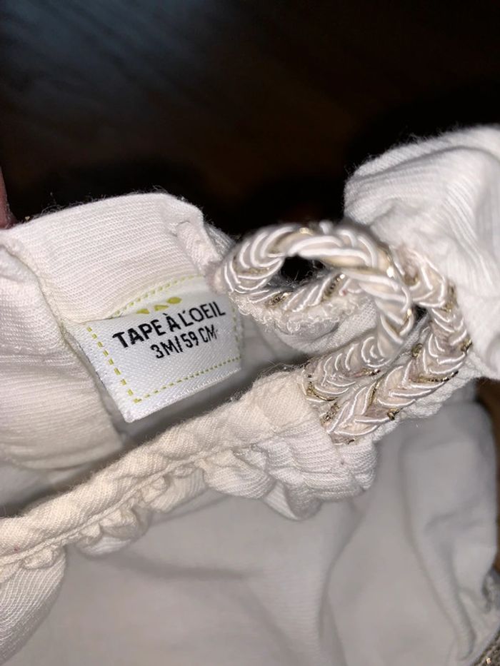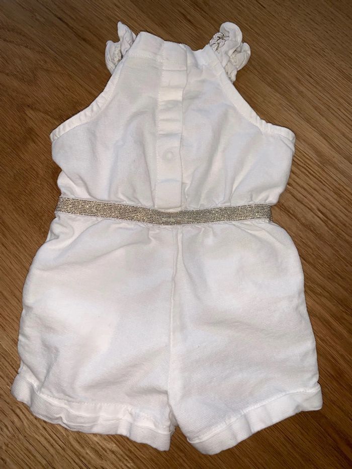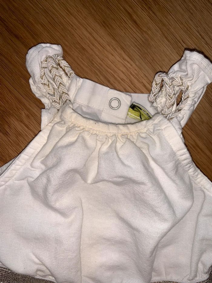 Combinaison bébé fille tao tape à l’œil Blanc Bretelles : tresses + volants Jambes courtes avec revers sur endroit Boutons pressions entrejambe + dos Encolure arrondie avec fronces (jauni idem photo - doit partir avec détachant) Poches Ceinture pailletée dorée Portée deux fois Taille 3 mois : 59 cm