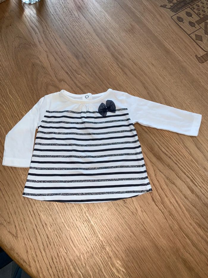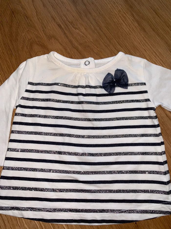 Tee-shirt bébé fille Kiabi Blanc à rayures bleu Marine et paillettes Noeud en tulle Noeud en tulle Encolure arrondie avec fronces (légèrement jauni idem photo- doit partir avec détachant) Manches longues Boutons pressions au dos Tissu souple élasthane Coupe évasée Bas courbe Porté une fois Taille 3mois