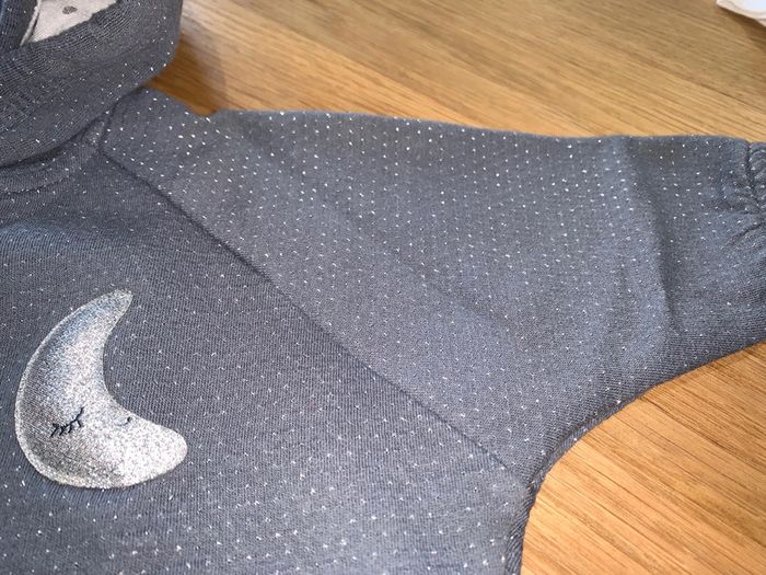 Gilet cardigan bébé fille Kiabi Type sweat ouvert gris anthracite Pois gris argentés à paillettes en All over Capuche lutin avec pompon Visuel application lune pailletée sur poitrine Manches chauves-souries longues resserrées aux poignets Bas courbe Ouverture fermeture : boutons pressions