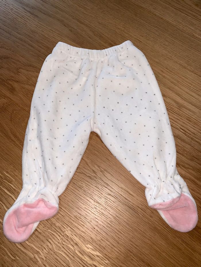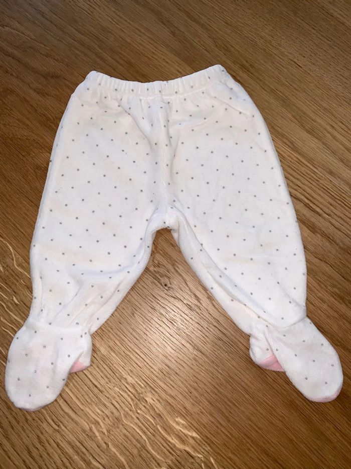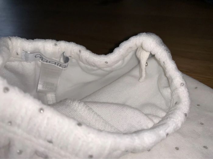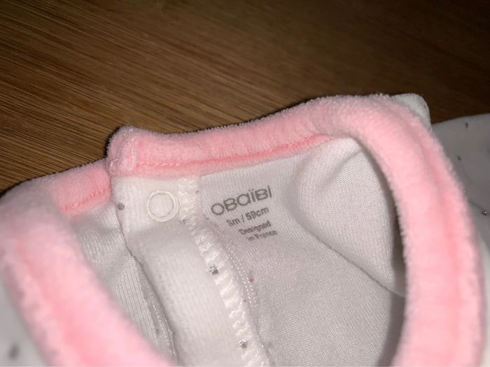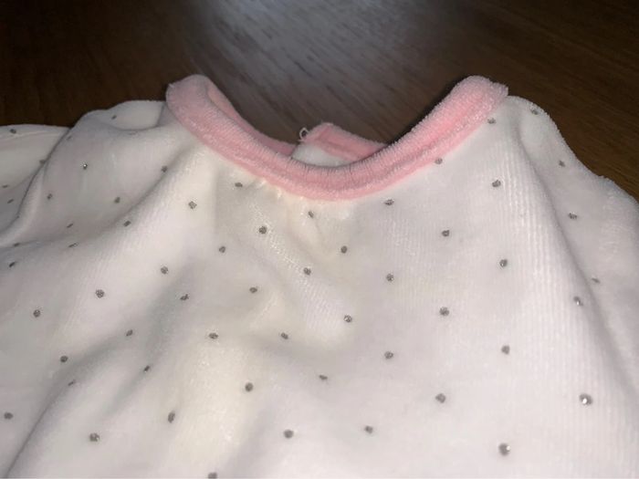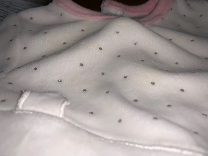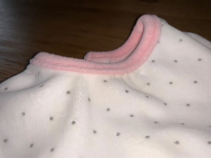 pyjama long deux pièces bébé fille Obaïbi Okaïdi Velours doux Blanc rose gris argenté paillettes tee-shirt: encolure arrondie manches longues (resserrées aux poignets) coupe évasée visuel tête de renard (application) + pois gris argentés pailletés en All Over Ouverture fermeture d’os: boutons pressions pantalon: élastiques taille jambes longues avec pieds couverts Système d’attaches (haut + bas) Porté une fois