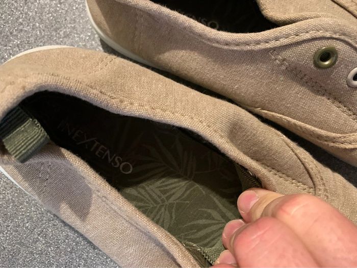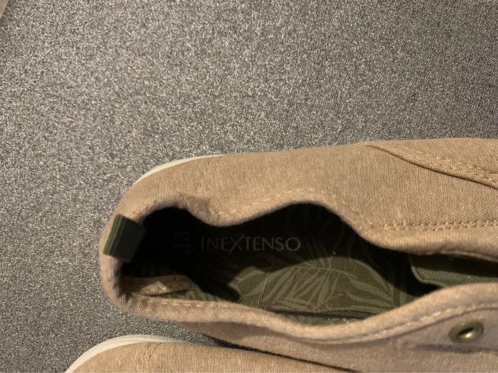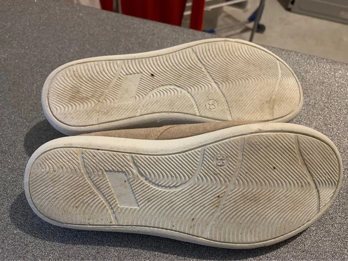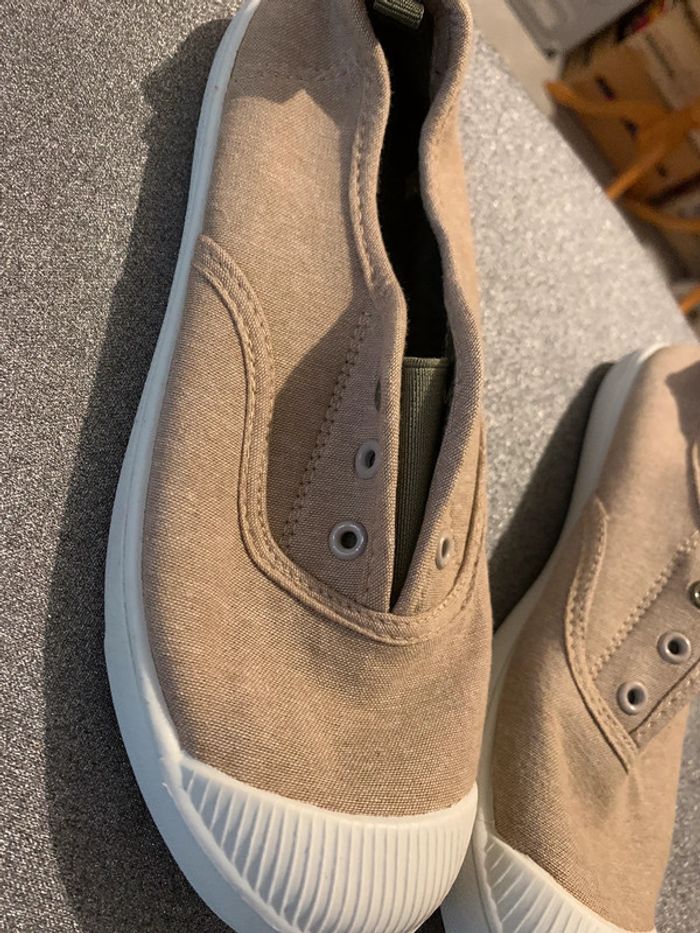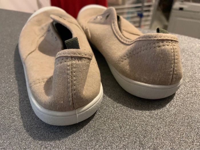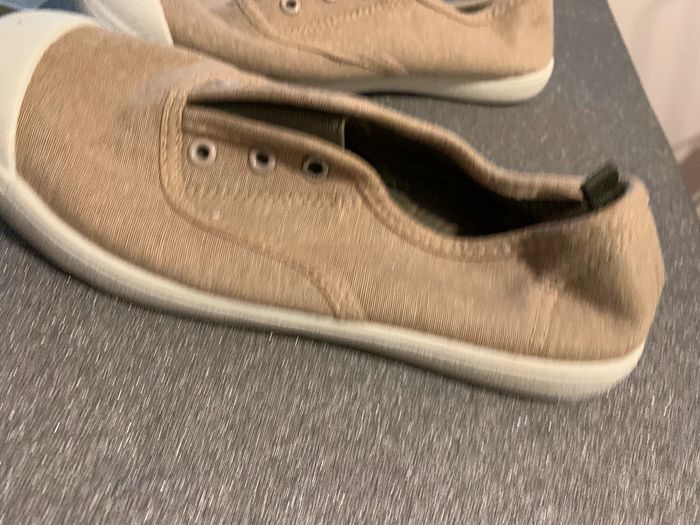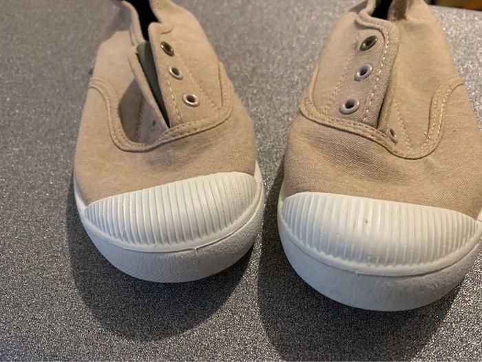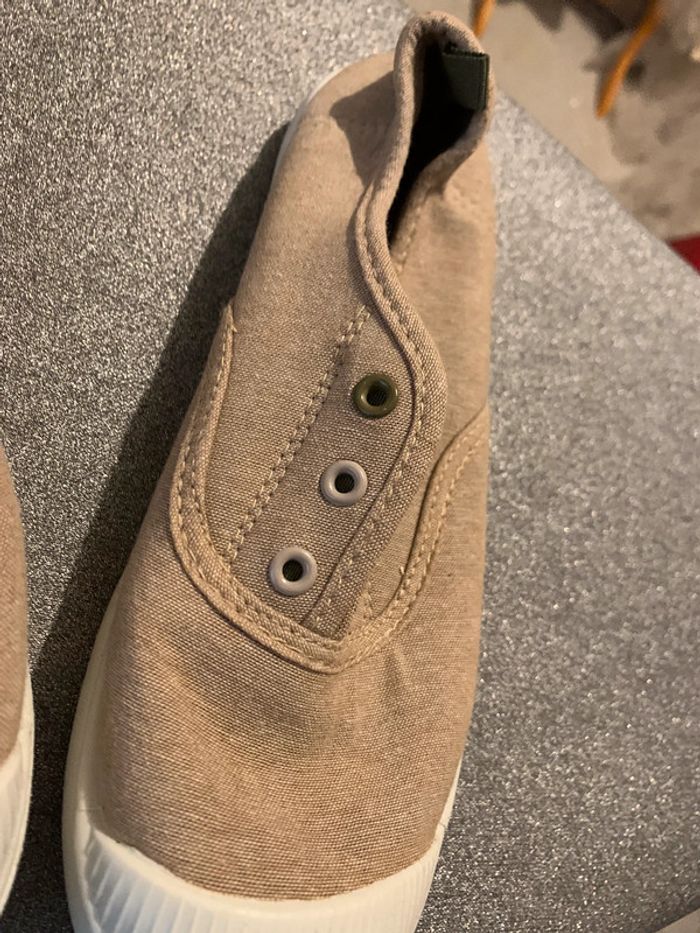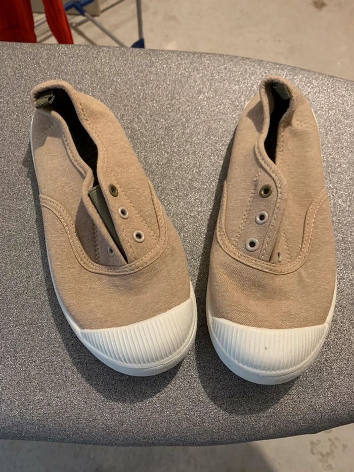 Chaussures baskets basses enfant mixte fille ou garçon un extenso Tissu beige Œillets colorés Élastique sur dessus de pied Semelles blanches Bouts arrondis Très peu servis (2 fois)