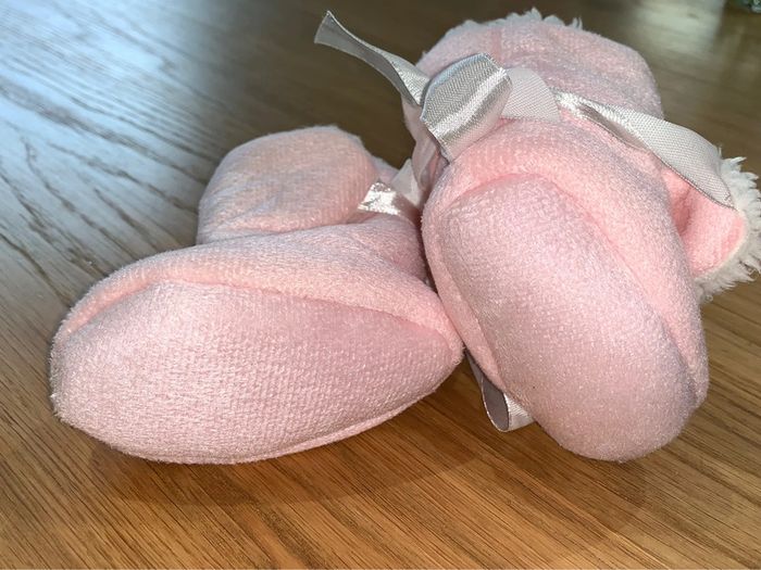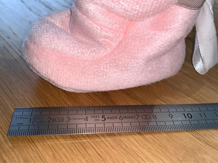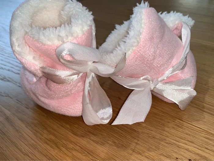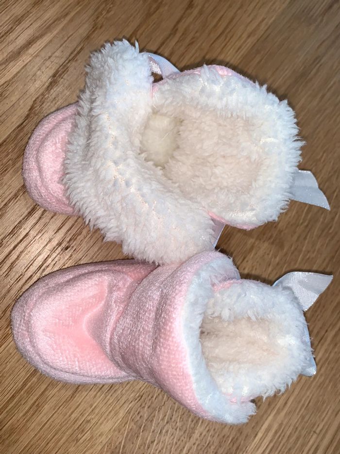 Chaussures bottines / chaussons bébé fille Tao tape à l’œil Rose + blanc Intérieur moumoute Noeud ruban Portées une seule fois