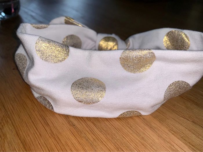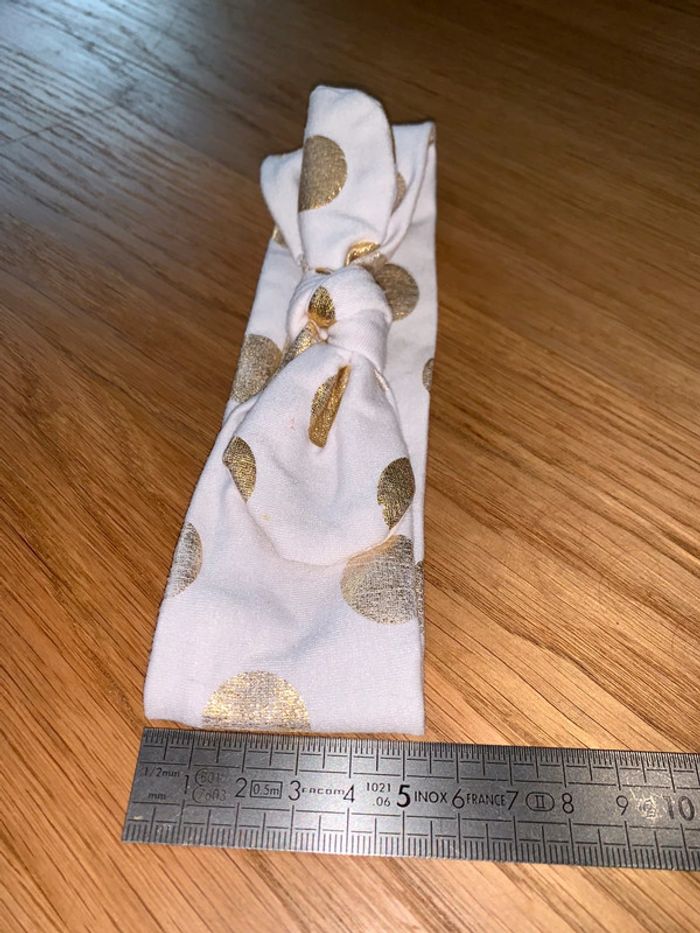 Bandeau tissu Tao tape à l’œil Motif pois Blanc doré Noeud sur le dessus Tour de tête 39 cm (bandeau non étiré) Accessoire coiffure cheveux