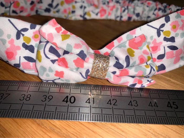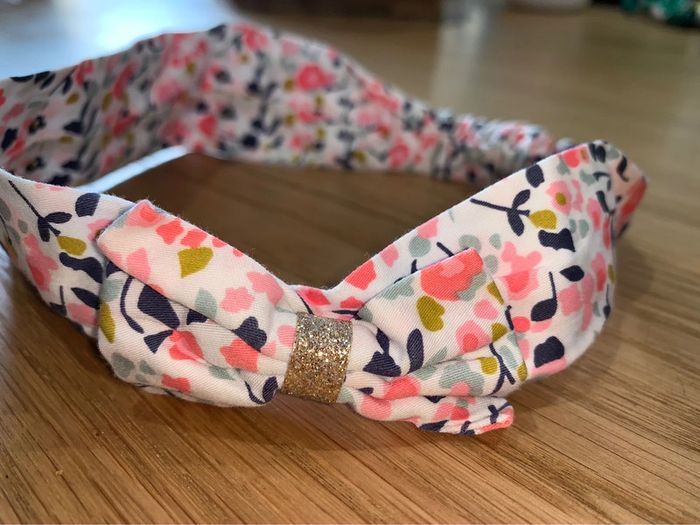 Bandeau tissu Tao tape à l’œil Motif fleuri blanc bleu-Marine corail rose ocre turquoise Noeud avec petite bande dorée à paillettes Tour de tête 41,5 cm (bandeau non étiré) Accessoire coiffure cheveux