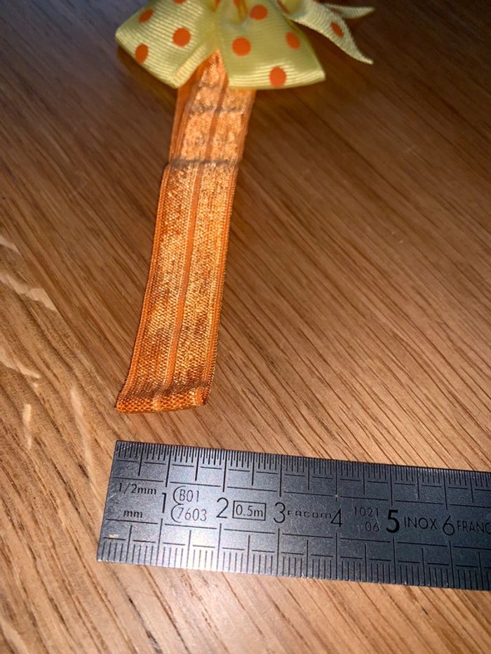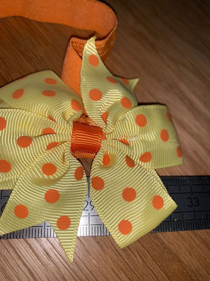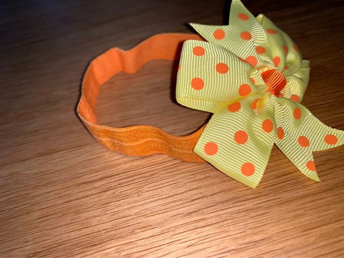 Bandeau élastique Tao tape à l’œil Orange jaune Noeud motif pois Tour de tête 29 cm (bandeau non étiré) Accessoire coiffure cheveux