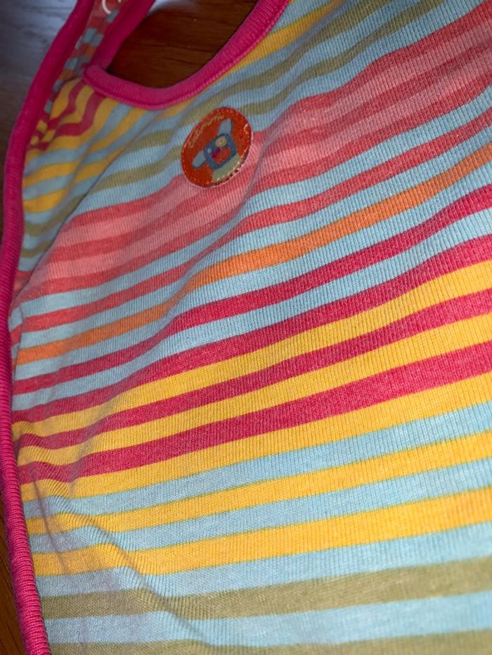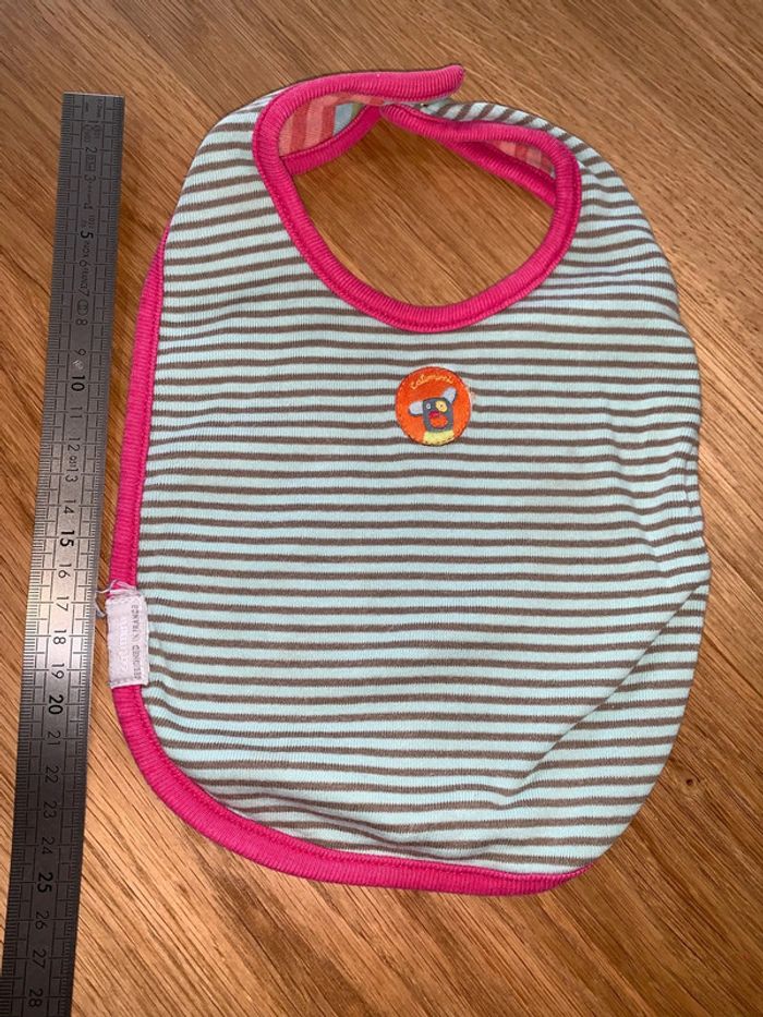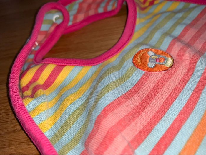 Bavoir bébé catimini Multicolore bleu rose jaune framboise vert gris Visuel rayures différentes entre devant et dos Jersey Réversible Étiquette décor Fermeture bouton pression Cf photos pour dimensions
