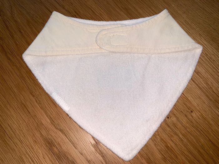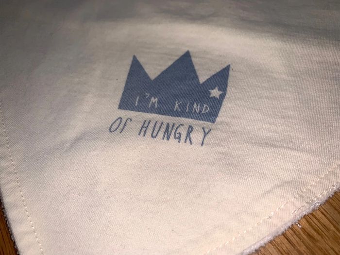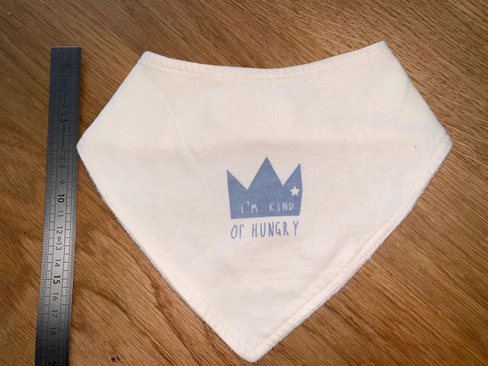 Bavoir triangle bébé tao tape à l’œil Bleu blanc Visuel couronne + I’m kind of hungry Jersey devant Éponge au dos Fermeture velcro Cf photos pour dimensions